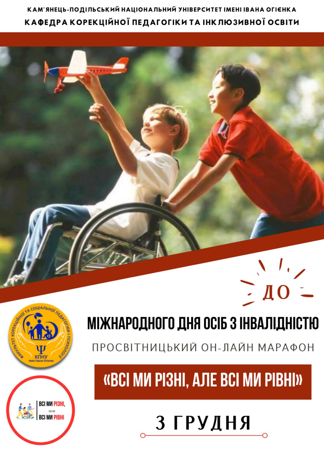 Сповідуючи цінність людського життя, як найважливішу, керуючись відкритістю своїх сердець і щирістю своїх душ, будучи свідомими свого професійного покликання та необхідності змінення світу на краще, здобувачі вищої освіти спеціальності 016 Спеціальна освіта. Олігофренопедагогіка та викладачі кафедри корекційної педагогіки та інклюзивної освіти факультету корекційної та соціальної педагогіки і психології Кам’янець-Подільського національного університету імені Івана Огієнка оголошують проведення просвітницького он-лайн марафону «Всі ми ‒ різні, але всі ми ‒ рівні».