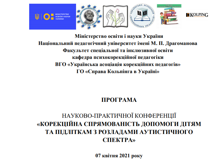 7 квітня 2021 року викладачі кафедри корекційної педагогіки та інклюзивної освіти взяли участь у науково-практичній конференції «Корекційна спрямованість допомоги дітям та підліткам з розладами аутистичного спектру» (м. Київ).