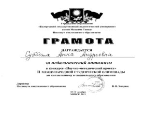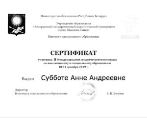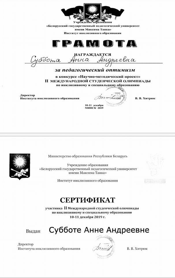 Вітаємо студентку факультету корекційної та соціальної педагогіки і психології Субботу Анну Андріївну, учасницю ІІ Міжнародної студентської олімпіади з інклюзивної та спеціальної освіти, що проходила 10-11 грудня в Мінську (Республіка Білорусь) із грамотою «За педагогічний оптимізм». Науковий керівник: Докучина Тетяна Олександрівна, кандидат педагогічних наук, доцент кафедри корекційної педагогіки та інклюзивної освіти.