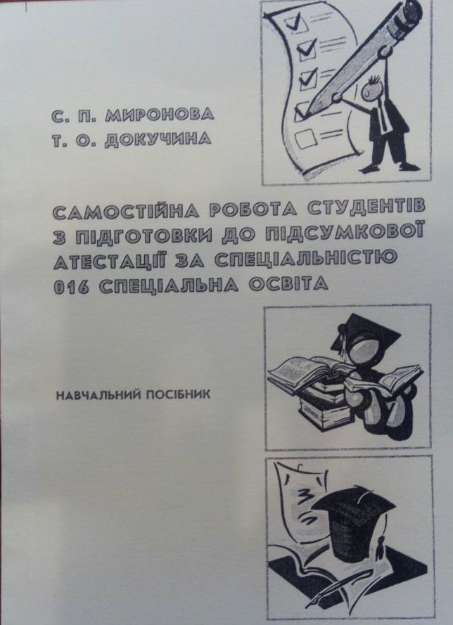 Вийшов друком навчальний посібник Миронової С.П., Докучиної Т.О. «Самостійна робота студентів з підготовки до підсумкової атестації за спеціальністю 016 Спеціальна освіта». У навчальному посібнику вміщено методичні рекомендації з підготовки бакалаврів спеціальності 016 Спеціальна освіта до підсумкової атестації.