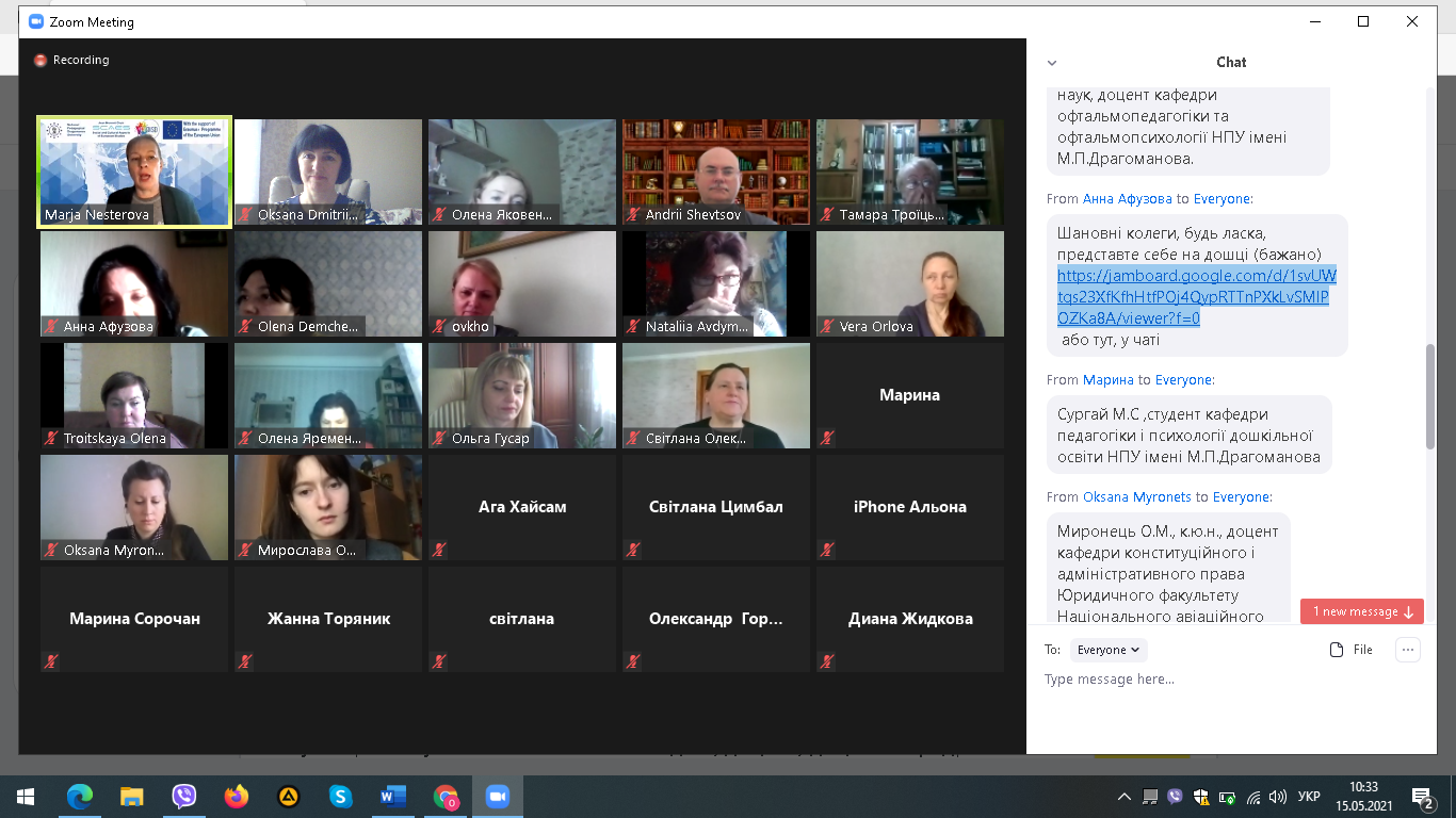 15.05.2021 року канд. пед. наук, доцент кафедри корекційної педагогіки та інклюзивної освіти Дмітрієва О.І. приймала участь в Міжнародному круглому столі з нагоди святкування Дня Європи в рамках імплементації проєкту напряму Жана Моне «Європейські цінності різноманіття та інклюзії для сталого розвитку».