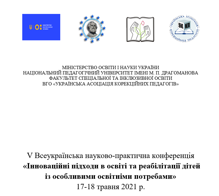 17-18 травня 2021 р. відбулась V Всеукраїнська науково-практична конференція «Інноваційні підходи в освіті та реабілітації дітей із особливими освітніми потребами» організована НПУ імені М.П.Драгоманова, факультетом спеціальної та інклюзивної освіти, ВГО «Українська асоціація корекційних педагогів» в якій брали участь викладачі кафедри корекційної педагогіки та інклюзивної освіти.