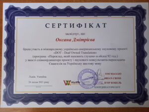 З 12 до 23 липня 2021 року у Львові на базі філософсько-богословського факультету Українського католицького університету відбувся міжнародний українсько-американський науковий проєкт «Deaf Owned Translation» (програма «Переклад, що належить глухим»), організаторами якого були американська організація Wycliffe Associates (WA) за підтримки єпархії м. Хільдестлейм (Німеччина) і Канадсько‐українського альянсу глухих та слабкочуючих (Канада).