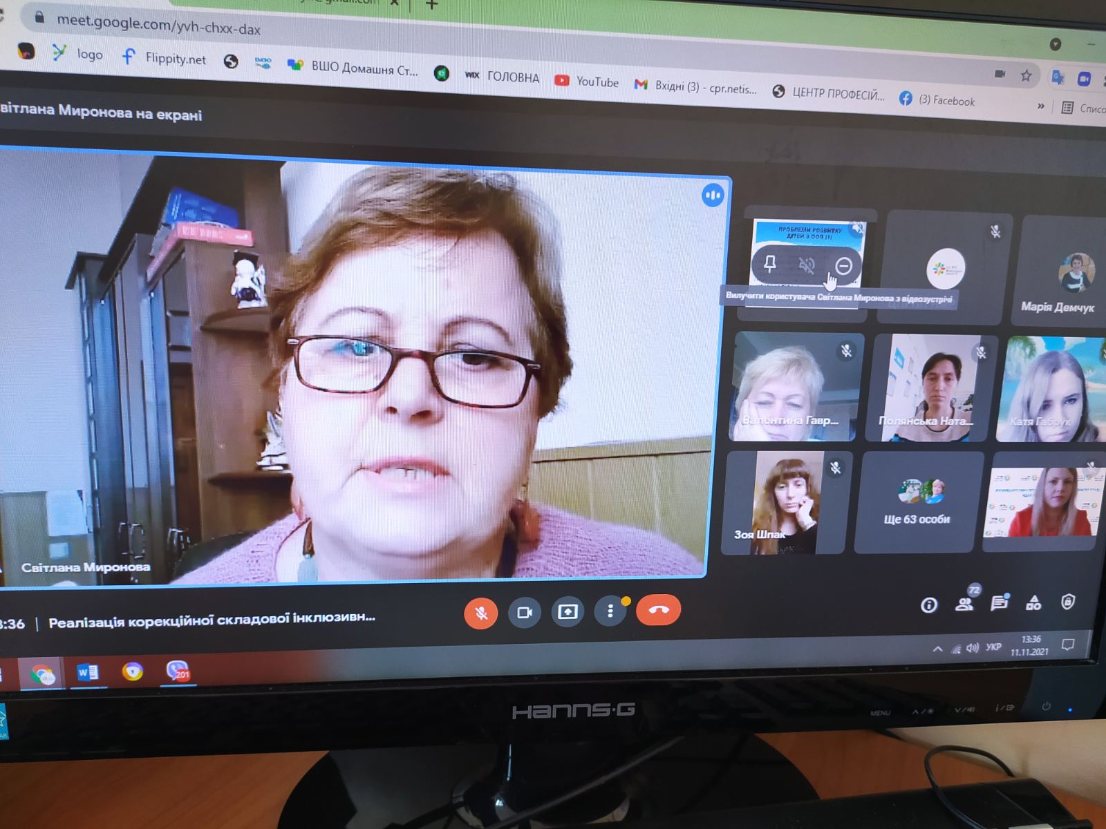 11.11.2021 р. професор кафедри, доктор педагогічних наук, професор Миронова С.П. прочитала лекцію «Реалізація корекційної складової інклюзивного навчання дітей з особливими освітніми потребами», організавану Центром професійного розвитку педагогічних працівників Нетішинської МТГ. Зустріч була організована для педагогічних працівників закладів освіти Нетішинської МТГ, кого цікавила дана тема. Всього було 86 осіб. Зокрема, на зустрічі були присутні: директор та спеціалісти ІРЦ, вчителі та вихователі, директори та заступники закладів освіти, асистенти вчителів/вихователів, психологи, дефектологи, логопеди, практичні психологи.