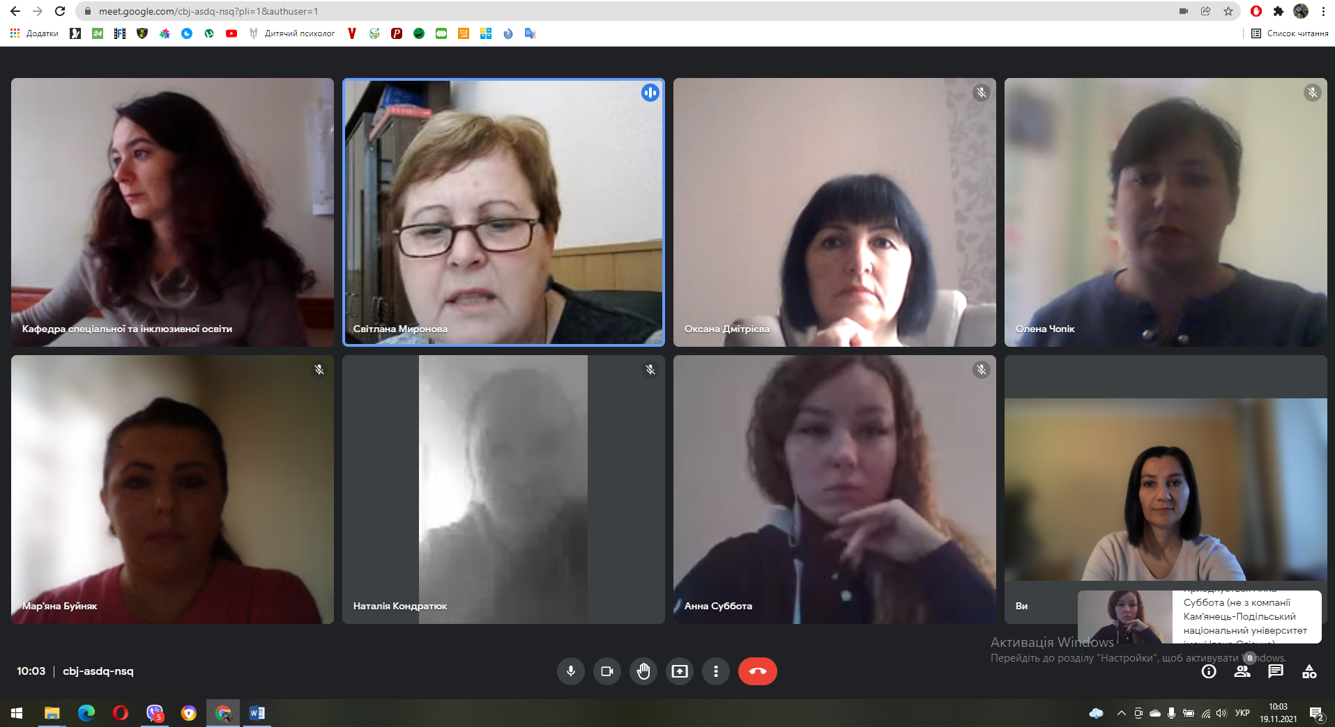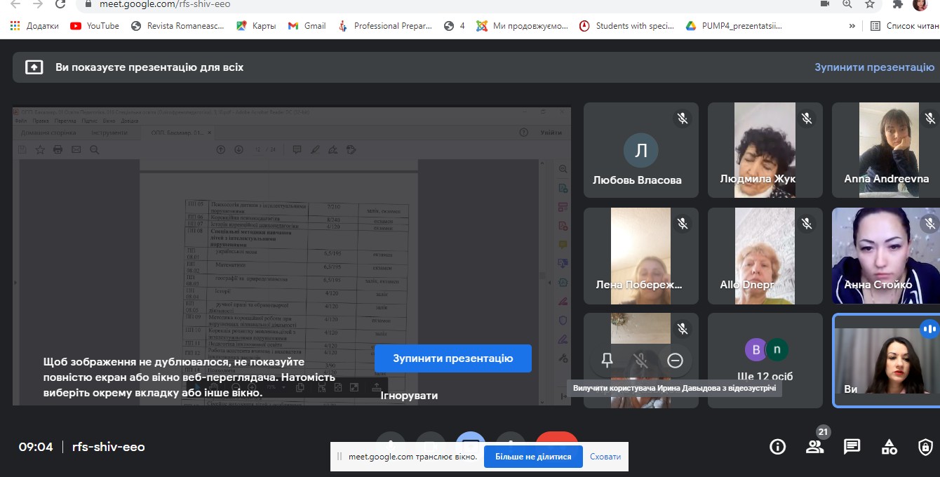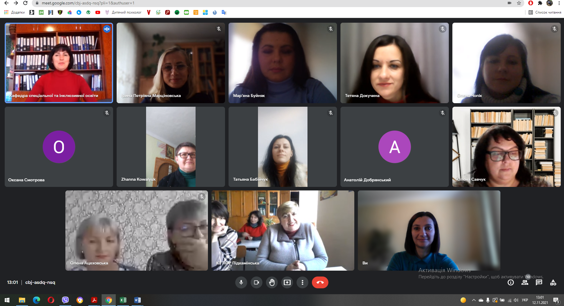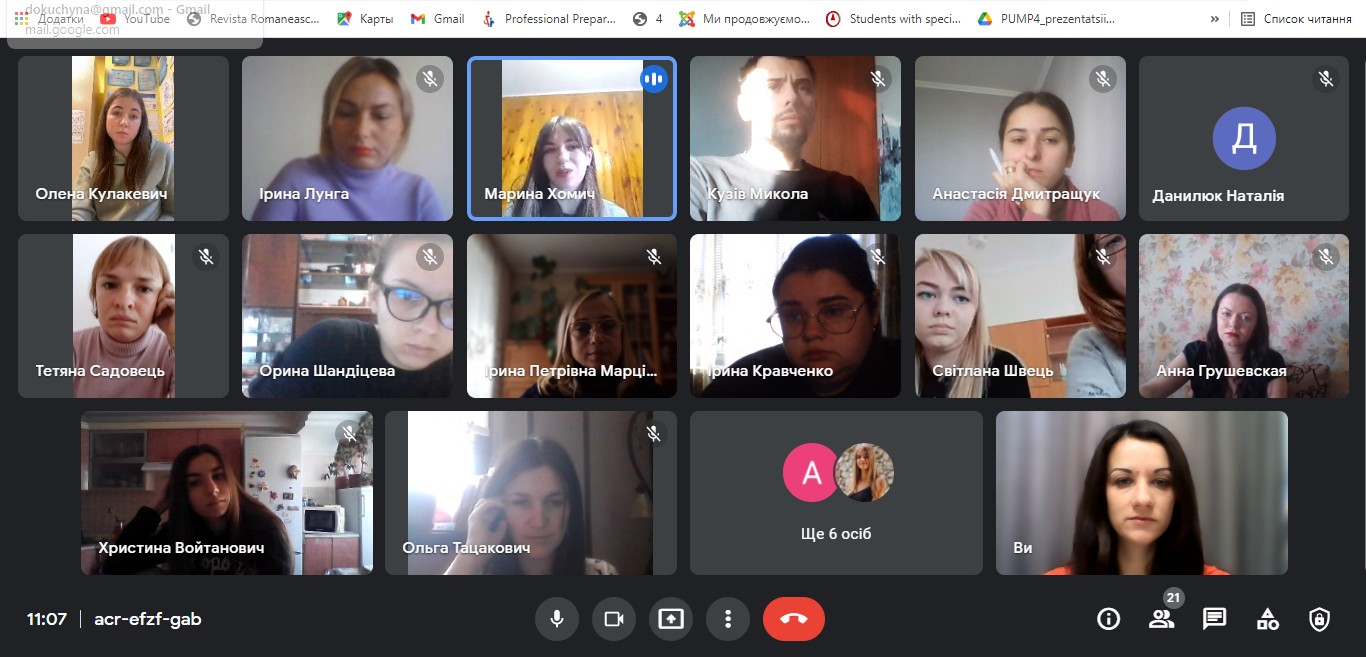 12 листопада 2021 року на платформі Google Meet відбулося розширене засідання кафедри спеціальної та інклюзивної освіти з обговорення освітньо-професійних програм «Спеціальна освіта (Олігофренопедагогіка)» та «Спеціальна освіта (Олігофренопедагогіка. Логопедія)» спеціальності 016 Спеціальна освіта ступенів вищої освіти «бакалавр» та «магістр». Також обговорили освітньо-наукову програму «Спеціальна освіта» третього рівня вищої освіти. В обговоренні брали участь викладачі кафедри, роботодавці, випускники факультету спеціальної освіти, психології і соціальної роботи, здобувачі вищої освіти. До розширеного засідання кафедри долучились: Ацеховська Олена Вікторівна – директор Піщанської спеціальної загальноосвітньої школи-інтернат Вінницької обласної ради; Коновалюк Жанна Дмитрівна – директор Печиніжинської школи, Савчук Олена Орестівна – директор Чернівецького обласного НРЦ № 1, Українець Богдан Михайлович – директор Підкаміньської спеціальної школи, Слободяник Валентина Йосипівна – заступник директора Піщанської спеціальної школи з навчально-виховної роботи, Марценюк Людмила Іванівна – заступник директора з виховної роботи; Гаман Алла Миколаївна – директор Солобковецького навчально-реабілітаційного центру Хмельницької обласної ради, випускниця; Приходько Ірина Володимирівна – директор КУ «Балашівський інклюзивно-ресурсний центр» Березнівської міської ради Рівненського району Рівненської області, випускниця; Бабійчук Тетяна Михайлівна – директор КУ «Інклюзивно-ресурсний центр №1» Тернопільської міської ради, випускниця. Під час зустрічі були проаналізовані результати опитування здобувачів вищої освіти «Освітня програма спеціальності очима здобувача вищої освіти», випускників зазначеної спеціальності «Анкета випускника», опитування потенційних роботодавців «Анкета роботодавця». Всі учасники розширеного засідання кафедри спеціальної та інклюзивної освіти долучилися до обговорення шляхів удосконалення процесу підготовки фахівців за освітньо-професійними програмами.