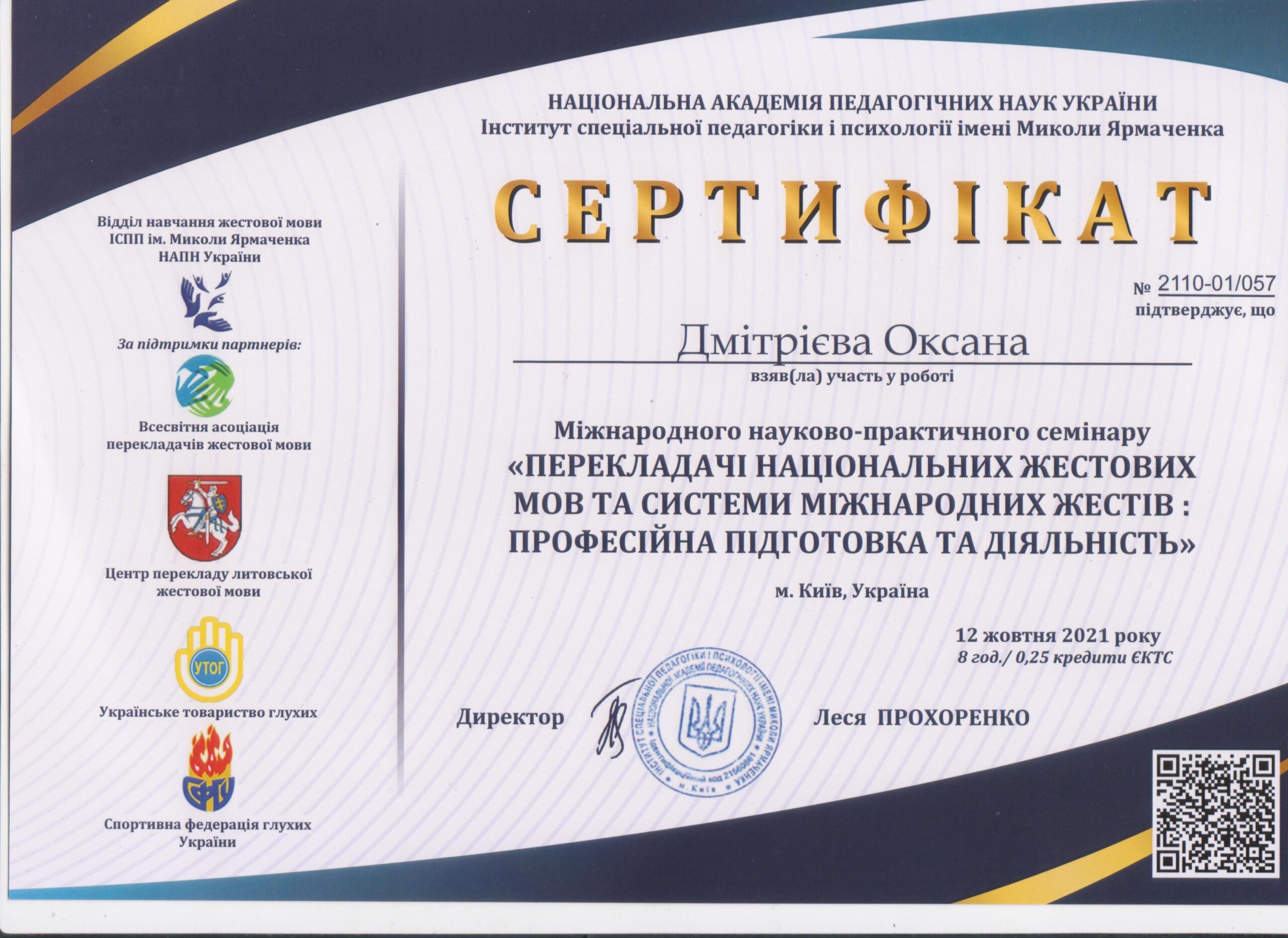12 жовтня 2021 року відбувся Міжнародний науково-практичний семінар «Перекладачі національних жестових мов та системи міжнародних жестів: професійна підготовка та діяльність»(м. Київ), організаторами якого виступив відділ навчання жестової мови Інституту спеціальної педагогіки і психології імені Миколи Ярмаченка НАПН України та Спортивна федерація глухих України за сприяння Міністерства соціальної політики України та підтримки партнерів ‒ Всесвітньої асоціації перекладачів жестової мови, Центру перекладу литовської жестової мови та Українського товариства глухих. У роботі семінару взяла участь доцент кафедри спеціальної та інклюзивної освіти, канд. пед. наук, доцент Дмітрієва О.І.