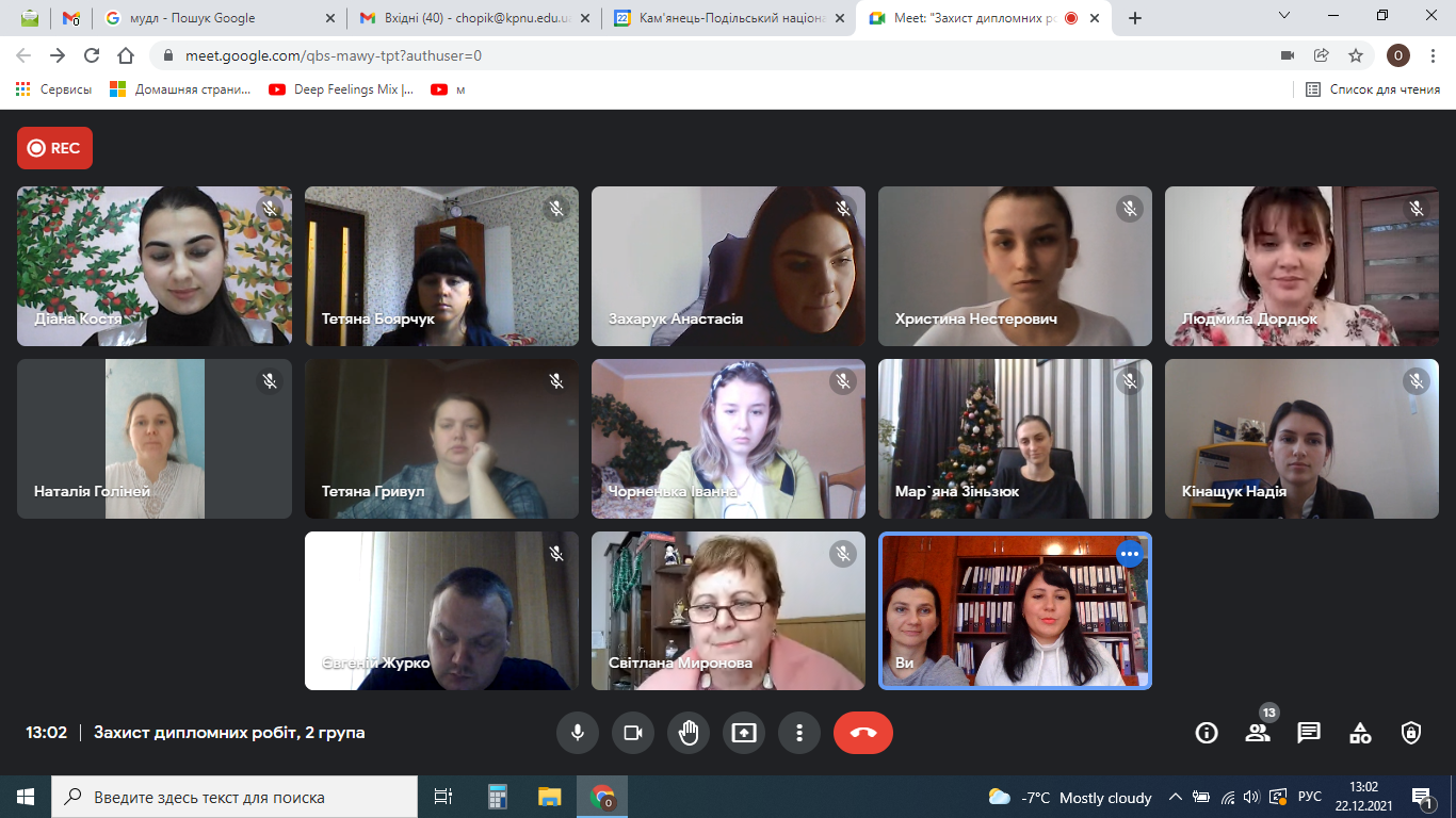 15-17 грудня 2021 року на факультеті спеціальної освіти, психології і соціальної роботи відбулися засідання екзаменаційної комісії у магістрів денної та заочної форм навчання спеціальності 016 Спеціальна освіта з використанням технічних засобів відеозв’язку (відповідно до Порядку проведення атестації здобувачів вищої освіти із застосуванням дистанційних технологій навчання в Кам’янець-Подільському національному університеті імені Івана Огієнка).
