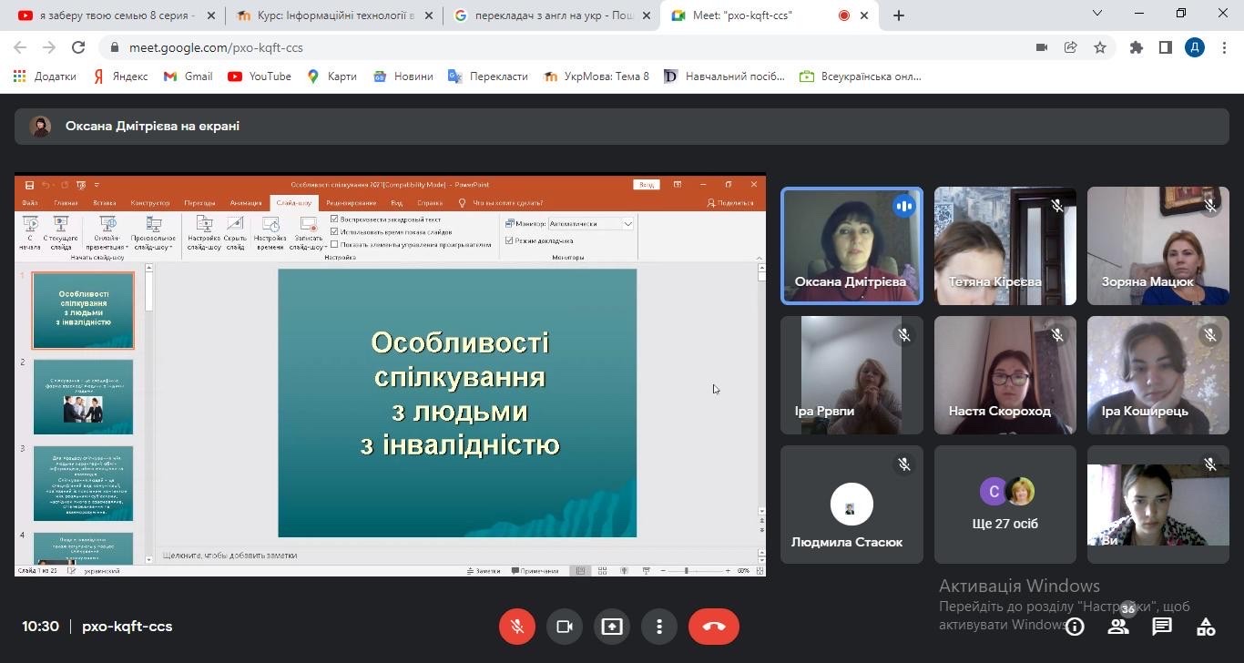14 грудня 2021 р. доцент кафедри спеціальної та інклюзивної освіти Кам՚янець-Подільського національного університету імені Івана Огієнка, кандидат педагогічних наук О.І.ДМІТРІЄВА провела гостьову лекцію з теми «Особливості спілкування з людьми з інвалідністю» у Волинському національному університеті імені Лесі Українки для здобувачів вищої освіти спеціальності 016 Спеціальна освіта. На лекції були присутні завідувач кафедри спеціальної та інклюзивної освіти Волинського національного університету імені Лесі Українки доктор педагогічних наук, професор КУЗАВА І.Б., доцент кафедри спеціальної та інклюзивної освіти, канд. філ. наук МАЦЮК З.С, доцент кафедри спеціальної та інклюзивної освіти, канд. пед. наук СТАСЮК Л.П., здобувачі вищої освіти першого(бакалаврського) рівня вищої освіти.