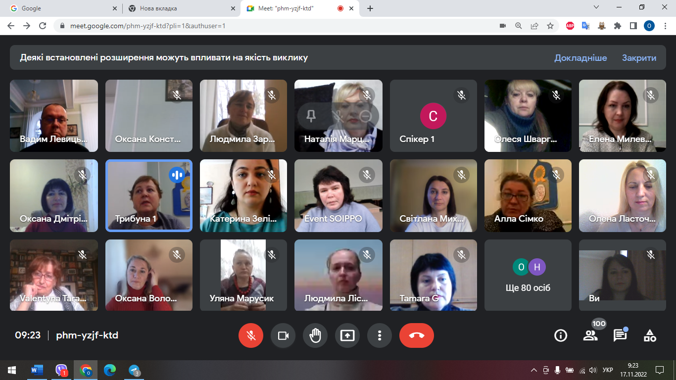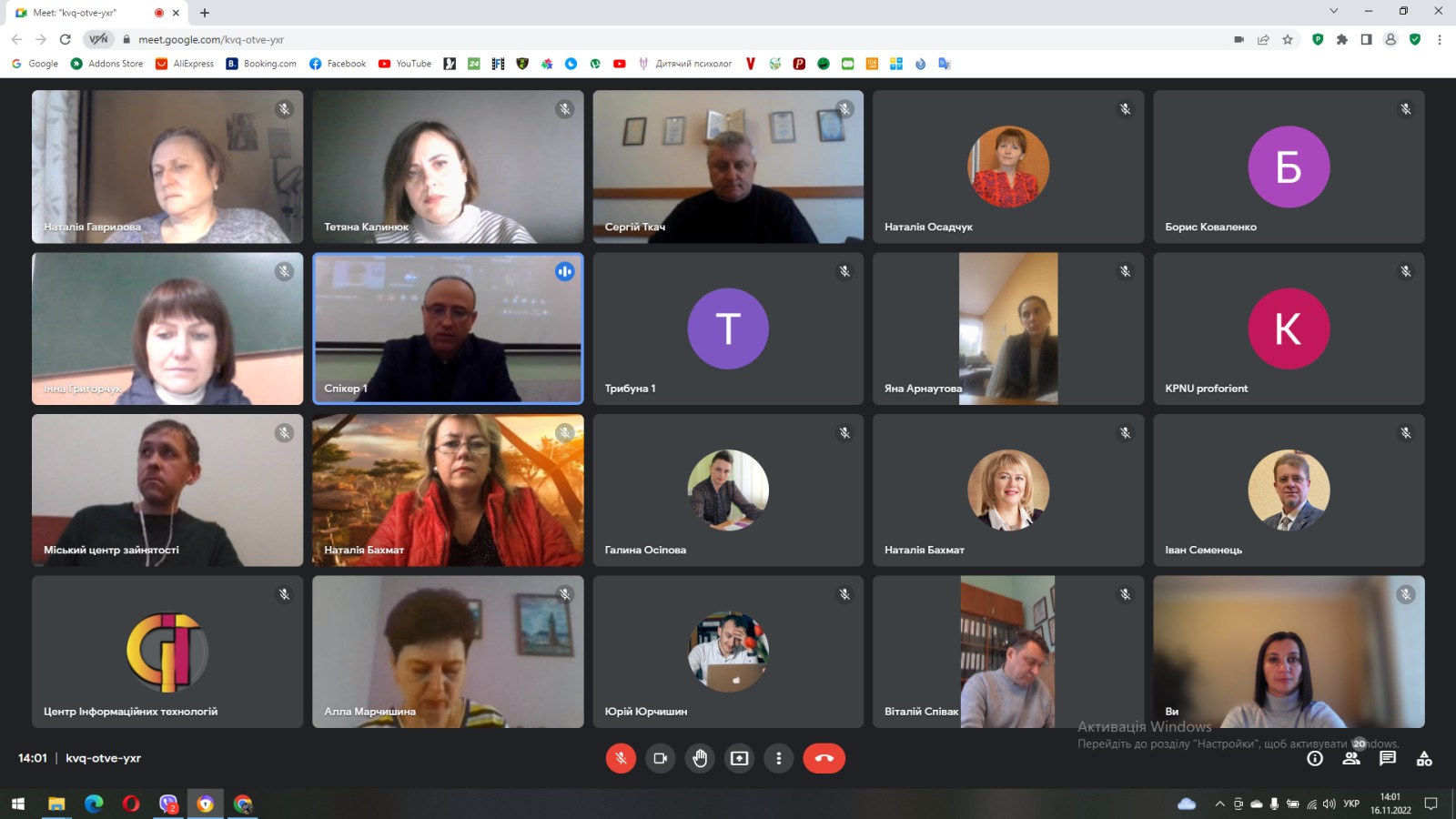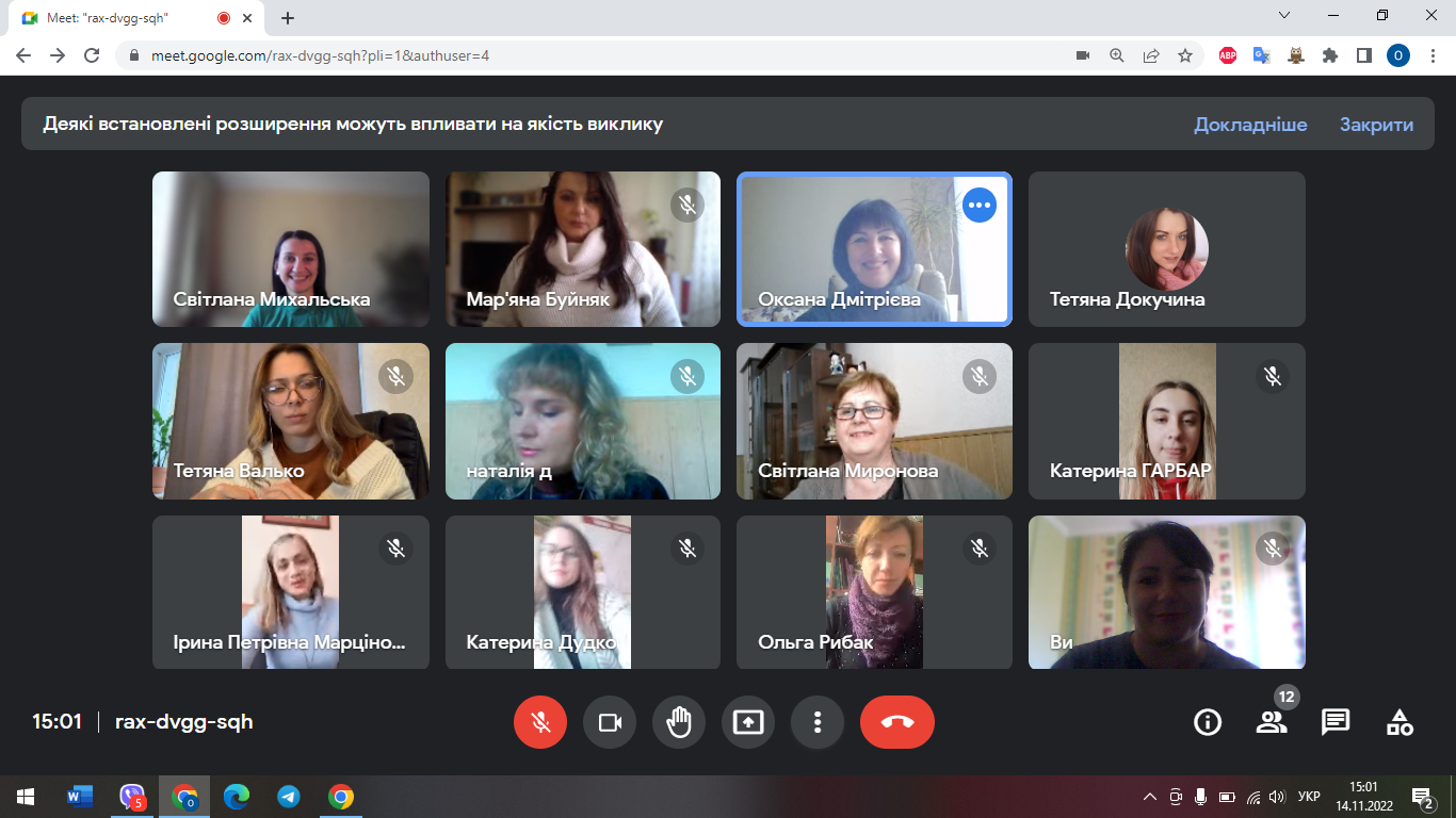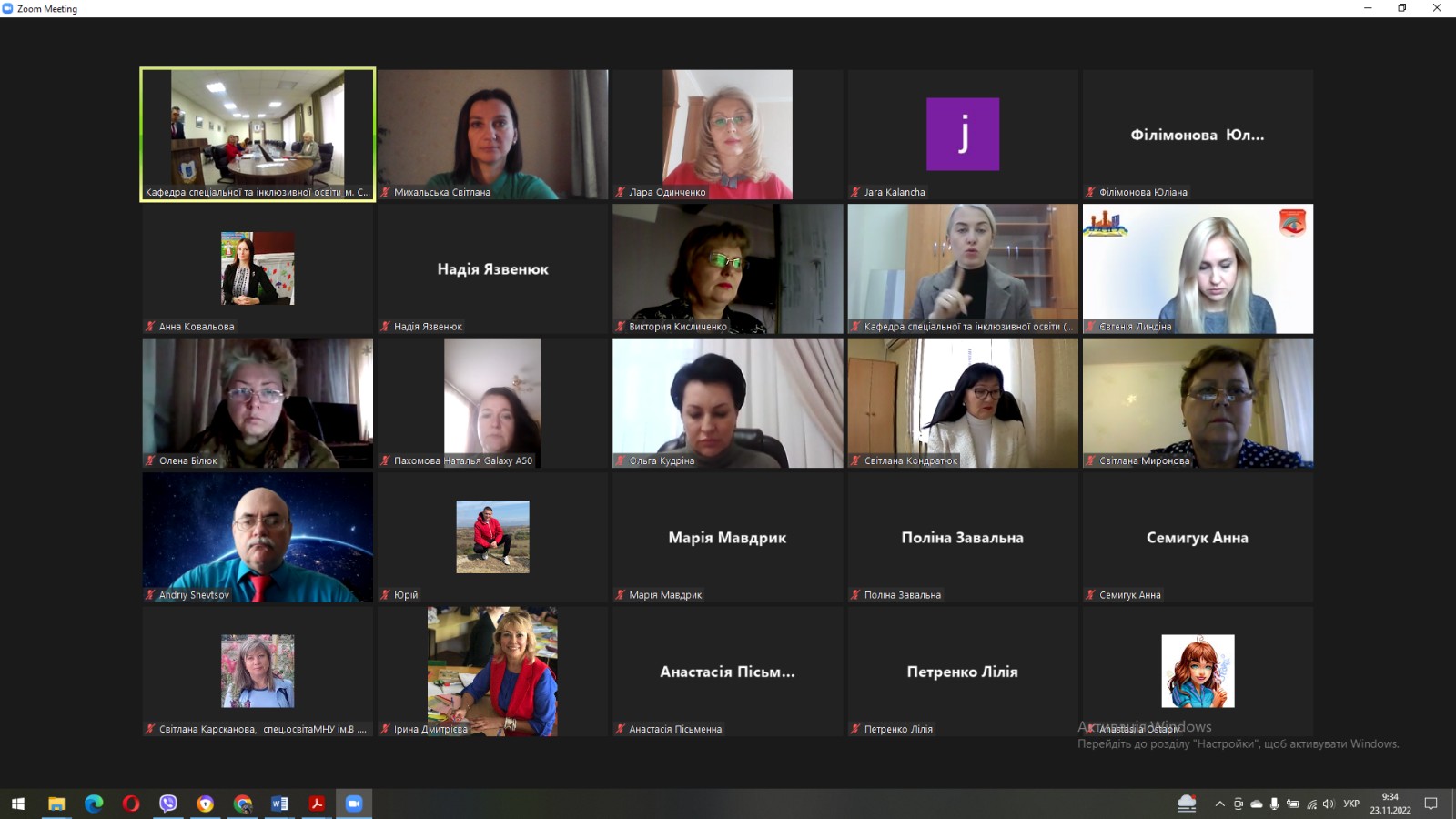 14.11.2022 року відбулось чергове засідання кафедри спеціальної та інклюзивної освіти, на якому було обговорено результати моніторингу ОПП і ОНП. На засідання кафедри було запрошено науково-педагогічних працівників кафедр спеціальної освіти Херсонського державного університету (доктор психологічних наук, професор Яковлєва С.Д.), теорії та методик початкової освіти К-ПНУ імені Івана Огієнка (доктор пед. наук, професор Бахмат Н.В.), психолого-медико-педагогічних основ корекційної роботи К-ПНУ імені Івана Огієнка (канд. психол. наук Михальська Ю.А.), директора закладу дошкільної освіти № 3 «Усмішка» Кам’янець-Подільської міської ради Хмельницької області Новікову Р.В., директора Хмельницького інклюзивно-ресурсного центру №1 Рибак О.А., фахівець ІРЦ Хотинської міської ради Ванько Н.А., вчитель-дефектолог Хмельницького закладу дошкільної освіти №33 «Джерельце» Хмельницької міської ради Сердечна В.М., здобувачів вищої освіти (Гарбар К., Бортняк Ю., Макарук К., Сливка Т.).