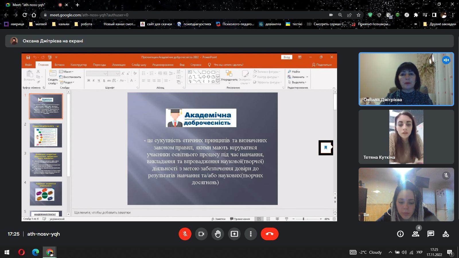 17 листопада із здобувачами освіти другого (магістерського) рівня вищої освіти групи SoO1-M21 в рамках «Години куратора», проведеної канд. пед. наук, доцентом кафедри спеціальної та інклюзивної освіти Дмітрієвою О.І., розглядалися питання академічної доброчесності. Із здобувачами вищої освіти обговорювалися різні варіанти порушень академічної доброчесності, види відповідальності за них, наголошувалося на окремих акцентах підготовки до захисту дипломної роботи магістра.