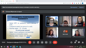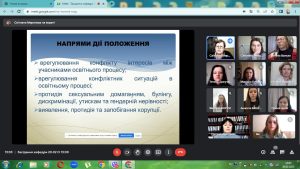 Гарант ОНП ознайомила здобувачів вищої освіти із розділами документа, напрямами дії Положення, порядком розв’язання конфліктних ситуацій, процедурою протидії сексуальним домаганням, булінгу, дискримінації, утискам та гендерній нерівності; надала адресу скриньки довіри та телефонів адміністрації.