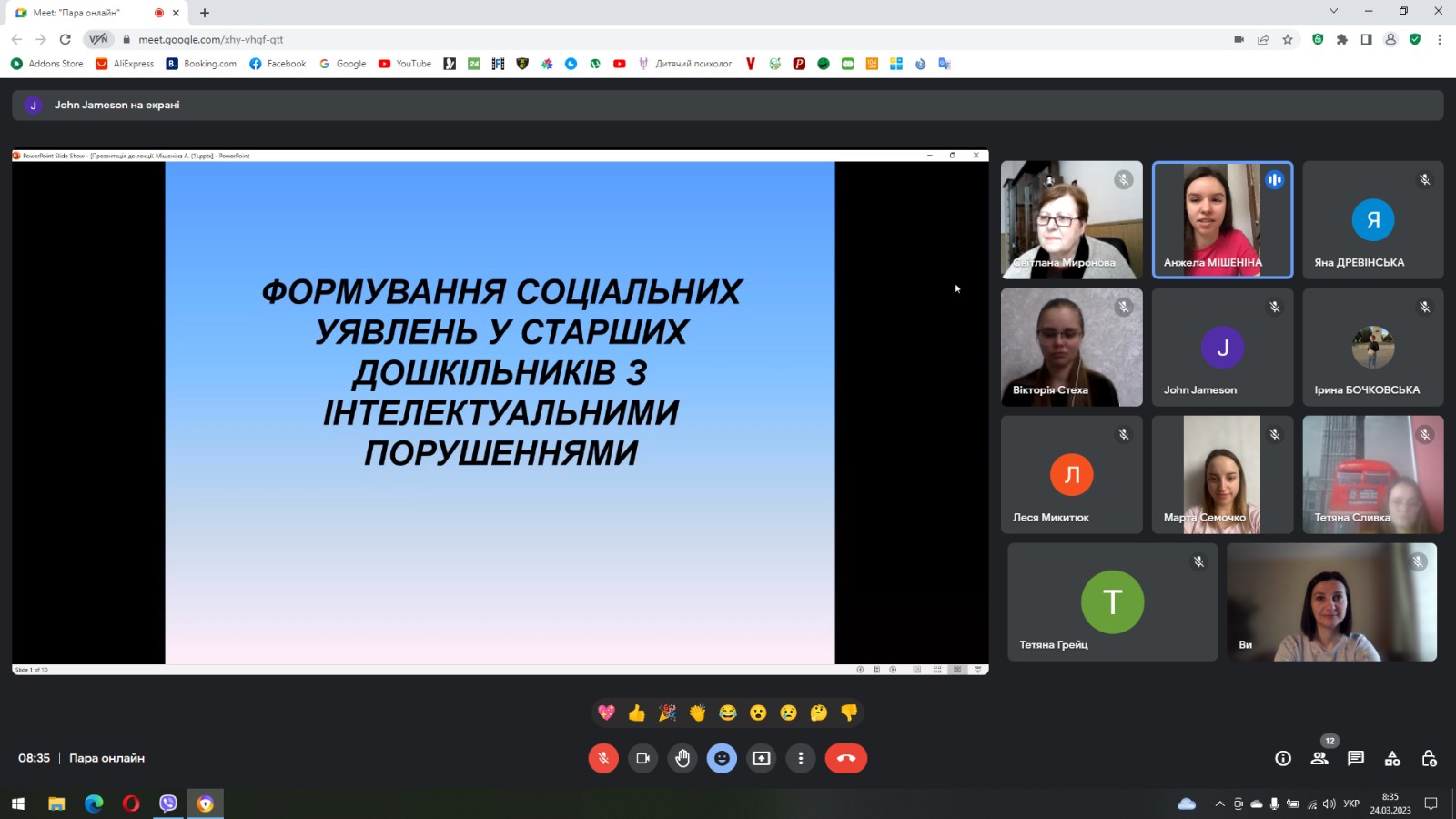 24 березня 2023 року у межах науково-педагогічної практики Анжела Мішеніна, аспірантка кафедри спеціальної та інклюзивної освіти, провела лекцію для здобувачів другого (магістерського) рівня вищої освіти на тему: “Формування соціальних уявлень у старших дошкільників з інтелектуальними порушеннями”. Лектор показав себе з накращої сторони. Матеріал було подано логічно, цікаво та доступно із застосуванням інноваційних методів навчання.