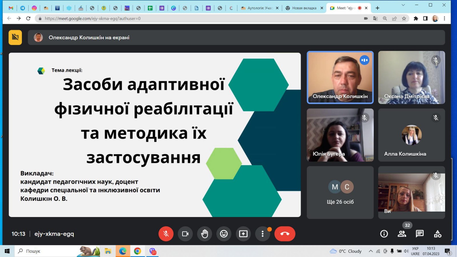 7 квітня 2023 р. в межах підписаного договору про співпрацю кафедри спеціальної та інклюзивної освіти Кам’янець-Подільського національного університету імені Івана Огієнка з кафедрою спеціальної та інклюзивної освіти Сумського державного педагогічного університету імені А.С. Макаренка для здобувачів вищої освіти першого (бакалаврського) рівня вищої освіти спеціальності 016 Спеціальна освіта, що навчаються за освітньо-професійною програмою «Спеціальна освіта (Олігофренопедагогіка. Логопедія)», було організовано гостьову лекцію доцента кафедри спеціальної та інклюзивної освіти Сумського державного педагогічного університету імені А.С. Макаренка, кандидата педагогічних наук Колишкіна О.В. з теми «Засоби адаптивної фізичної реабілітації та методика їх застосування».
