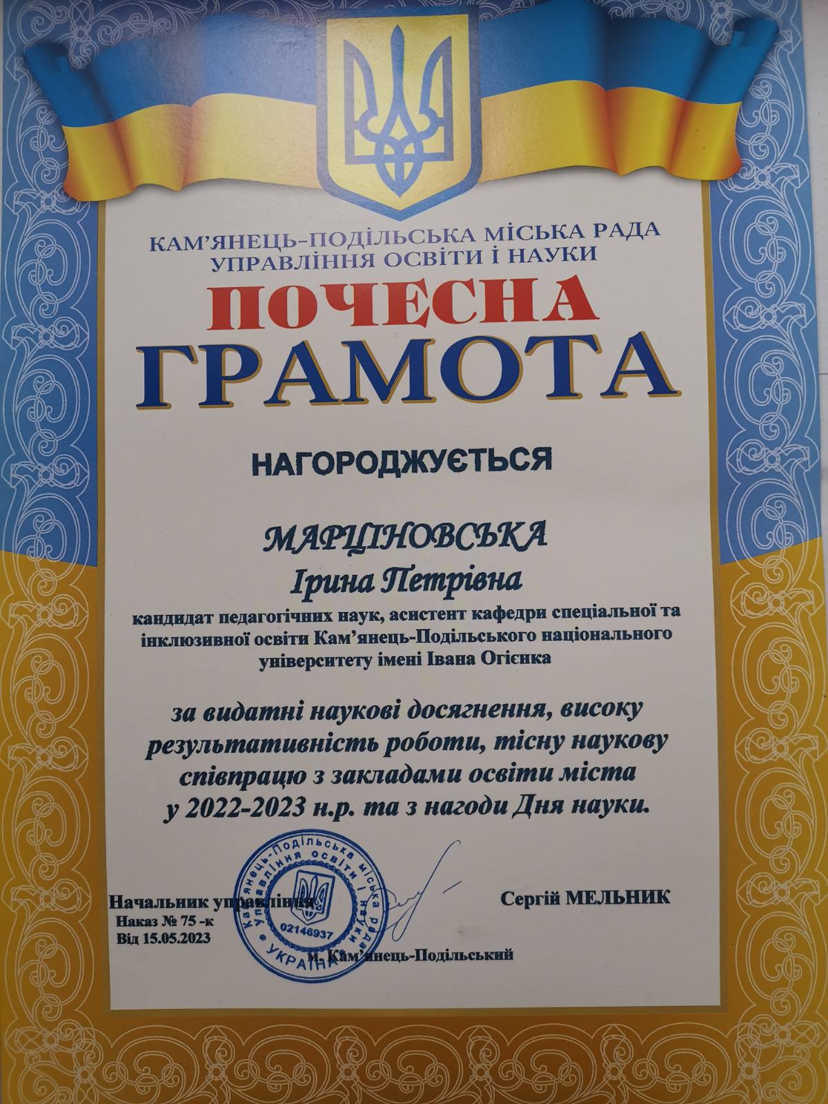 Колектив кафедри спеціальної та інклюзивної освіти щиро вітає кандидата педагогічних наук, асистента кафедри Ірину Петрівну МАРЦІНОВСЬКУ з нагородженням почесною грамотою за видатні наукові досягнення, високу результативність роботи, тісну наукову співпрацю з закладами освіти міста у 2022-2023 н. р. та з нагоди Дня науки!