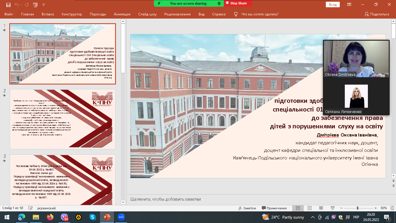 Сьогодні, 18 травня, з нагоди прийдешнього Дня науки та в межах вивчення ВОК «Сурдопсихологія», для здобувачів вищої освіти першого (бакалаврського) рівня вищої освіти спеціальності 016 Спеціальна освіта відбулася гостьова лекція доктора педагогічних наук, завідувача відділу освіти дітей з порушеннями слуху Інституту спеціальної педагогіки і психології імені М. Ярмаченка НАПН України Литовченко С.В., під час якої здобувачі вищої освіти мали змогу познайомитися з новаціями в освіті дітей з порушеннями слуху з урахуванням сучасних міжнародних підходів до освіти дітей з порушеннями слуху та індивідуального підходу до кожної дитини; з науково-методичним забезпеченням освіти дітей з порушеннями слуху, зокрема, з оригінальними підручниками, створеними відповідно до сучасної концепції Нової української школи та з урахуванням специфіки навчання дітей з порушеннями слуху; з навчально-методичними посібниками для педагогів та батьків дітей з порушеннями слуху; з сучасними підходами до оцінки особливих освітніх потреб.