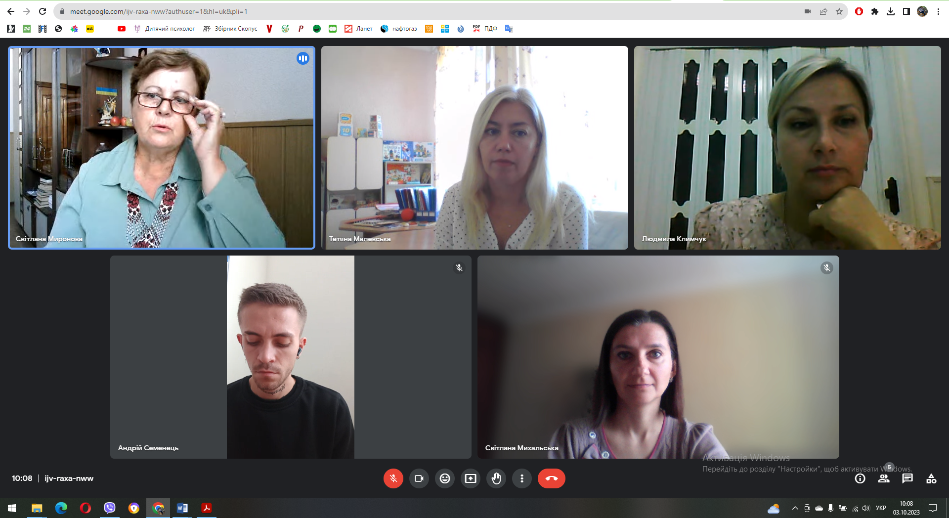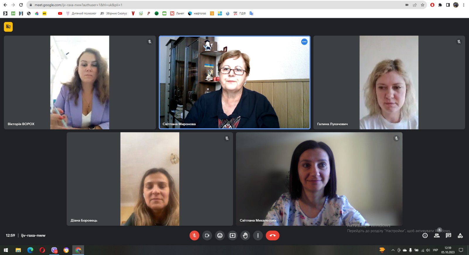 5 жовтня Світлана Миронова, гарант ОНП, проректор з наукової роботи, доктор педагогічних наук, професор, спільно із Світланою Михальською, членом проєктної групи, завідувачем кафедри спеціальної та інклюзивної освіти, доктором психологічних наук, доцентом, обговорили ОНП «Спеціальна освіта» третього (освітньо-наукового) рівня вищої освіти за спеціальністю 016 Спеціальна освіта з аспірантами 2-3 року навчання. Аспіранти схвалили ОНП. Її зміст та реалізація цілком задовольняє їхні очікування.