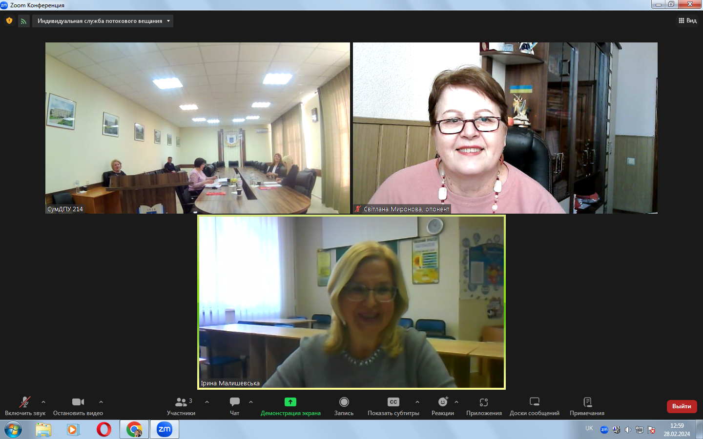 Доктор педагогічних наук, професор Світлана МИРОНОВА 28 лютого 2024 року взяла участь як опонент у роботі Разової спеціалізованої вченої ради Сумського державного педагогічного університету імені А. С. Макаренка по захисту дисертації доктора філософії Олени Сергіївни Позняк з галузі знань 01 Освіта / Педагогіка на тему: «Організаційно-методичні засади створення інклюзивного освітнього середовища в закладі загальної середньої освіти» за спеціальністю 016 Спеціальна освіта.