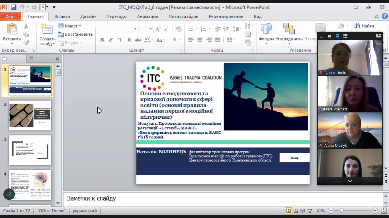04-05 березня науково-педагогічні працівники кафедри спеціальної та інклюзивної освіти взяли участь у тренінговій програмі «Основи самодопомоги та кризової допомоги в сфері освіти» (основні правила надання першої емоційної підтримки), організованій ISRAEL TRAUMA COALITION в Україні. Модуль 1. Протоколи та моделі емоційної регуляції: «4 стихії», «Безперервність життя» та модель BASIC Ph (8 годин). За час курсу викладачі ознайомилися з офіційними протоколами допомоги у кризових ситуаціях, методами екстреного реагування під час гострої реакції на стрес, отримали чіткі покрокові рекомендації щодо першої психоемоційної підтримки, оцінки можливої психологічної травматизації тощо.