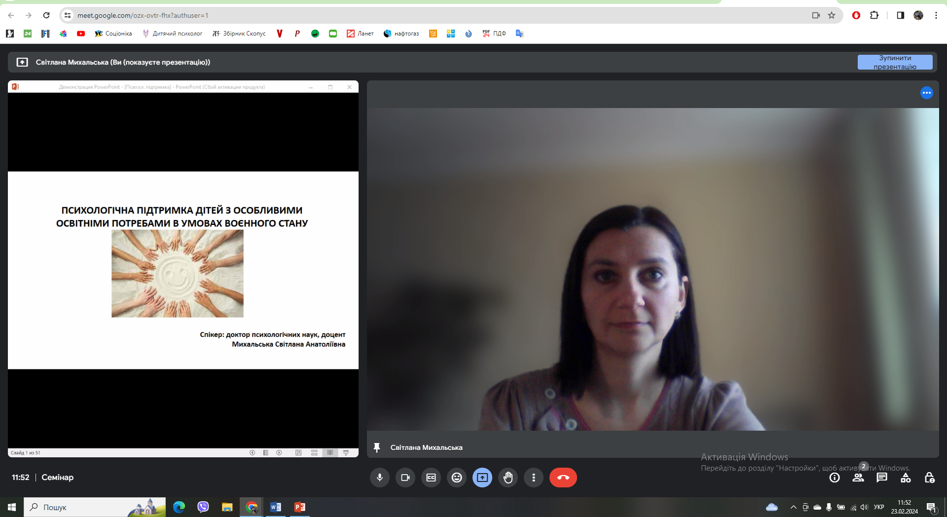За запитом адміністрації комунального закладу Одеський навчально-реабілітаційний центр «Формадо» Одеської обласної ради впродовж 8-29 лютого 2024 року доктором психологічних наук, доцентом Михальською С.А. був проведений науково-практичний семінар «Психологічна підтримка дітей з особливими освітніми потребами в умовах воєнного стану» (16 год.).