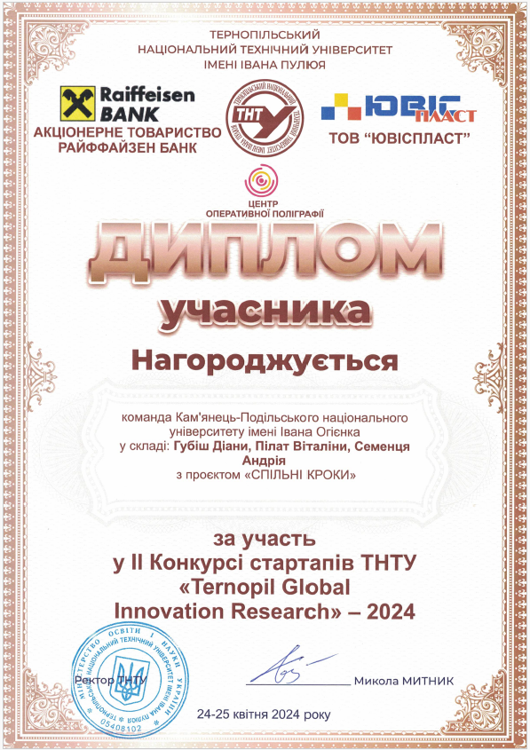 24-25 квітня 2024 року в дистанційному форматі проходив конкурс стартапів Тернопільського національного технічного університету імені Івана Пулюя «Ternopil Global Innovation Research». Кафедру спеціальної та інклюзивної освіти Кам’янець-Подільського національного університету імені Івана Огієнка з проєктом «Спільні кроки» представили Семенець Андрій Іванович (здобувач третього (освітньо-наукового) рівня вищої освіти), Губіш Діана Миколаївна (здобувач другого (магістерського) рівня вищої освіти), Пілат Віталіна Ярославівна (здобувач першого (бакалаврського) рівня вищої освіти). Проєкт передбачає створення середовища, яке допомагає підвищити якість життя та навчання дітей з ООП і підтримати їхніх батьків і вчителів у цьому процесі. Керівники проєкту: доктор психологічних наук, доцент, завідувач кафедри спеціальної та інклюзивної освіти Світлана Михальська, кандидат педагогічних наук, доцент Тетяна Докучина.
