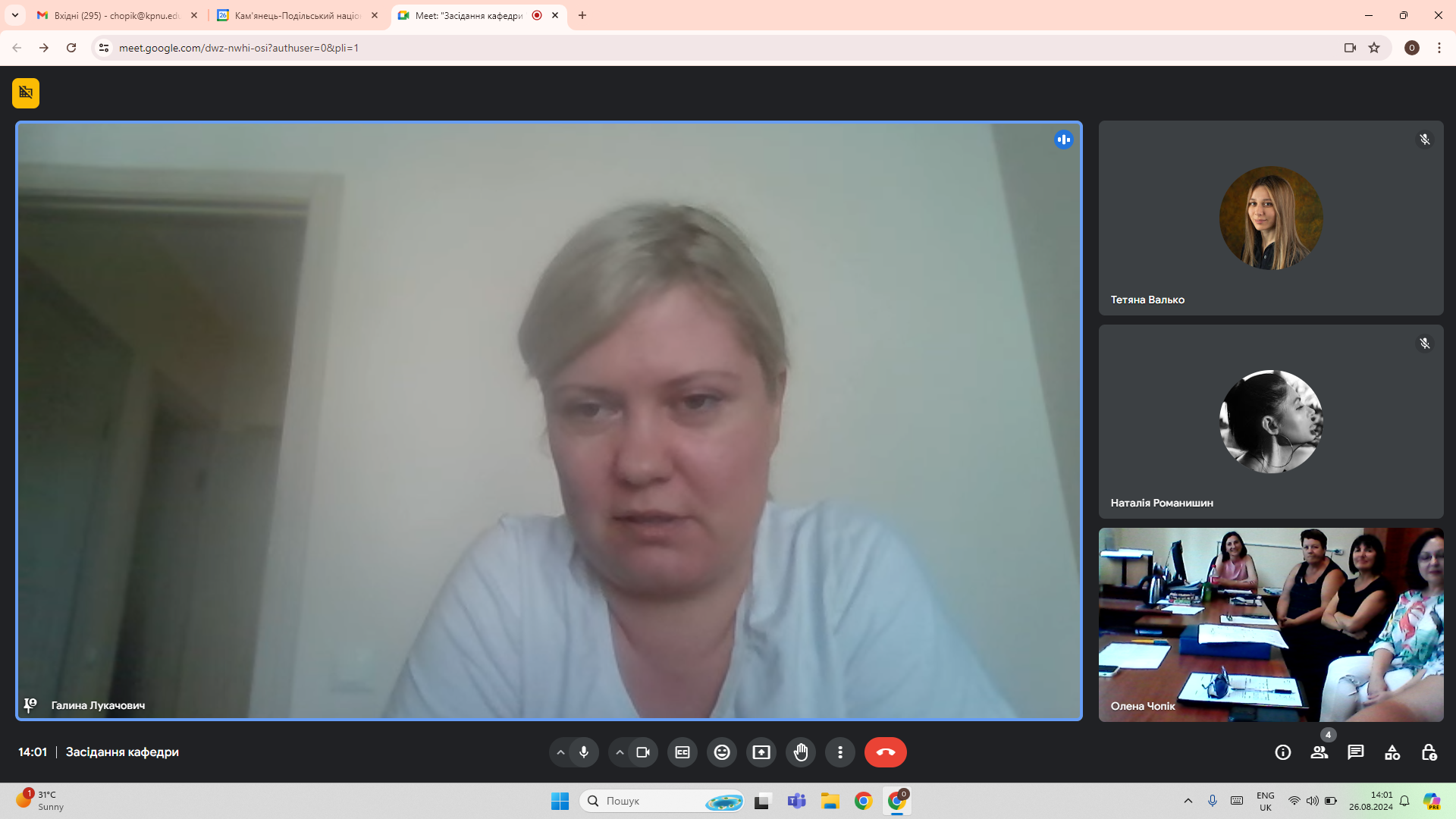 26 серпня 2024 року на засіданні кафедри спеціальної та інклюзивної освіти слухали звіти здобувачів вищої освіти ступеня доктора філософії І-ІІІ р. н. про виконання індивідуальних планів, зокрема, аспірантів 1 р.н. – А.І.Семенця, С.В.Старика, Т.М.Мелевської, Н.С.Романишиної; аспірантки 2 р.н. – Д.Боровець; аспіранток 3 р.н. – Г.О.Лукачович, В.І.Ворох. Рішенням членів кафедри усі звіти були затверджені, аспіранти атестовані і переведені на наступний навчальний рік.