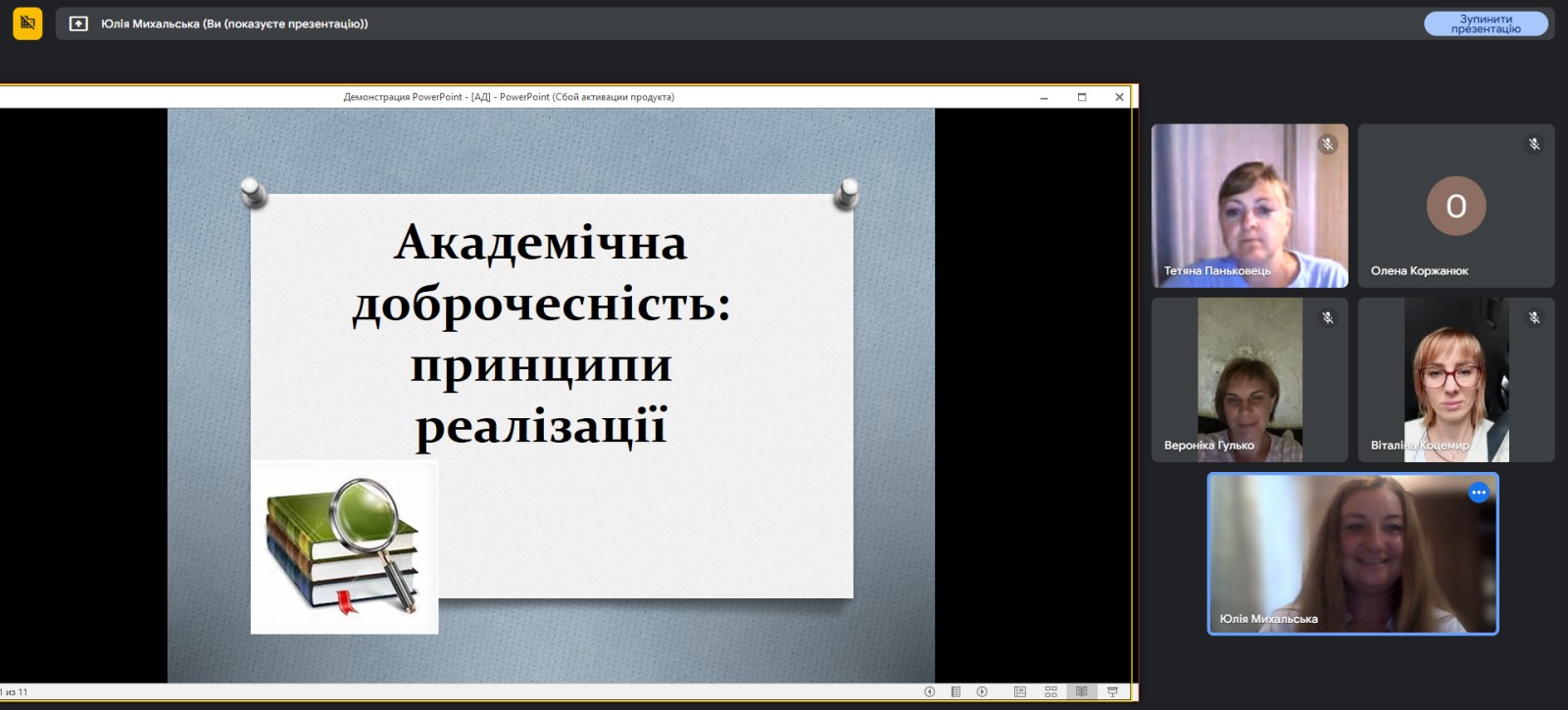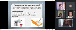 12 вересня 2024 року в межах виробничої дослідницької практики зі спеціальності член комісії з питань академічної доброчесності Михальська Ю.А. провела зустріч-дискусію на тему: «Академічна доброчесність: принципи реалізації» зі здобувачами вищої освіти другого (магістерського) рівня вищої освіти спеціальності 016 Спеціальна освіта зі спеціалізації 016.02 Олігофренопедагогіка. Здобувачів вищої освіти було ознайомлено з принципами академічної доброчесності, особливу увагу приділили «академічному плагіату», можливостям виявлення академічного плагіату у науковій роботі.