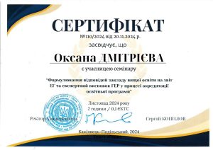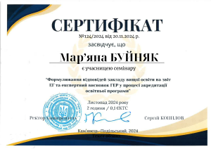 Протягом вересня-листапада 2024 року гарант освітньої програми “Корекційна психопедагогіка та інклюзивне навчання” першого (бакалаврського) рівня вищої освіти кандидат психологічних наук, доцент Буйняк М.Г. брала участь у програмі підвищення кваліфікації гарантів освітніх програм “Акредитація освітніх програм: механізми забезпечення якості вищої освіти в К-ПНУ”.