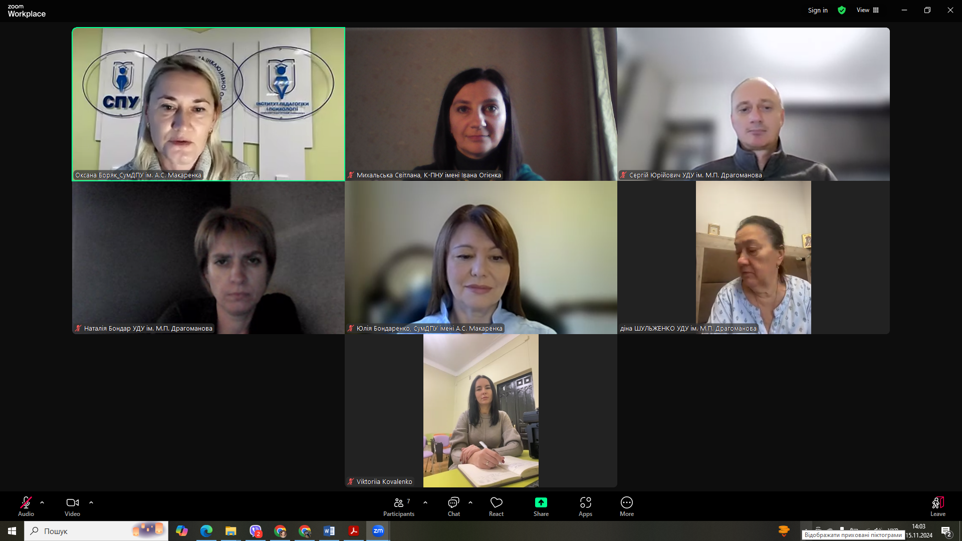 15 листопада 2024 року зав. кафедри Михальська С.А. взяла участь у зустрічі з академічною спільнотою з метою обговорення змін до ОПП спеціальностей 016 Спеціальна освіта. До зустрічі долучились представники Сум, Києва, Харкова.