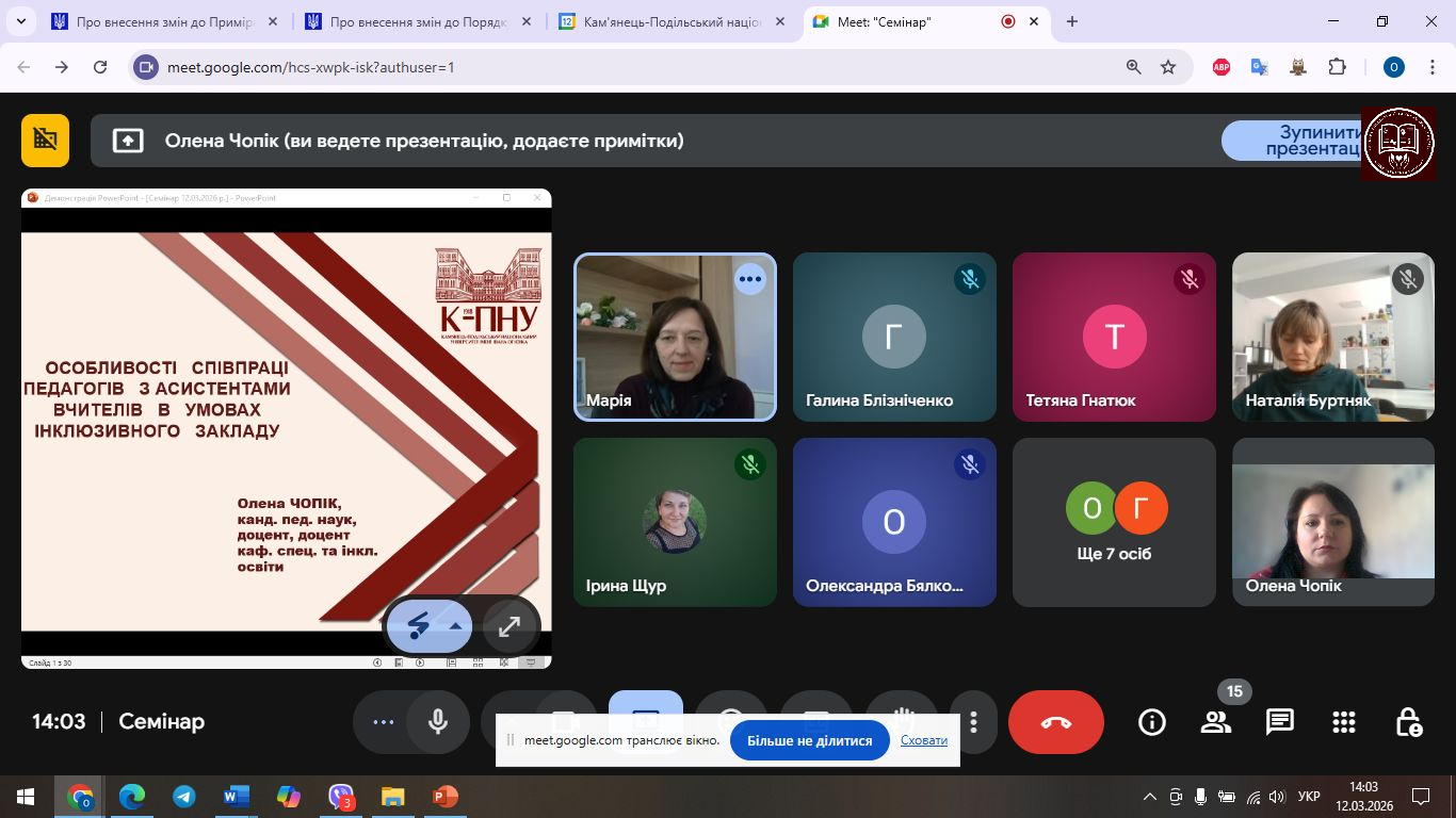 12 березня 2026 року в рамках співпраці з КУ «Інклюзивно-ресурсний центр» Борщівської міської ради доцент Олена Чопік провела семінар на тему: «Особливості співпраці педагогів з асистентами вчителів в умовах інклюзивного закладу» для вчителів предметів і асистентів вчителів інклюзивних класів.