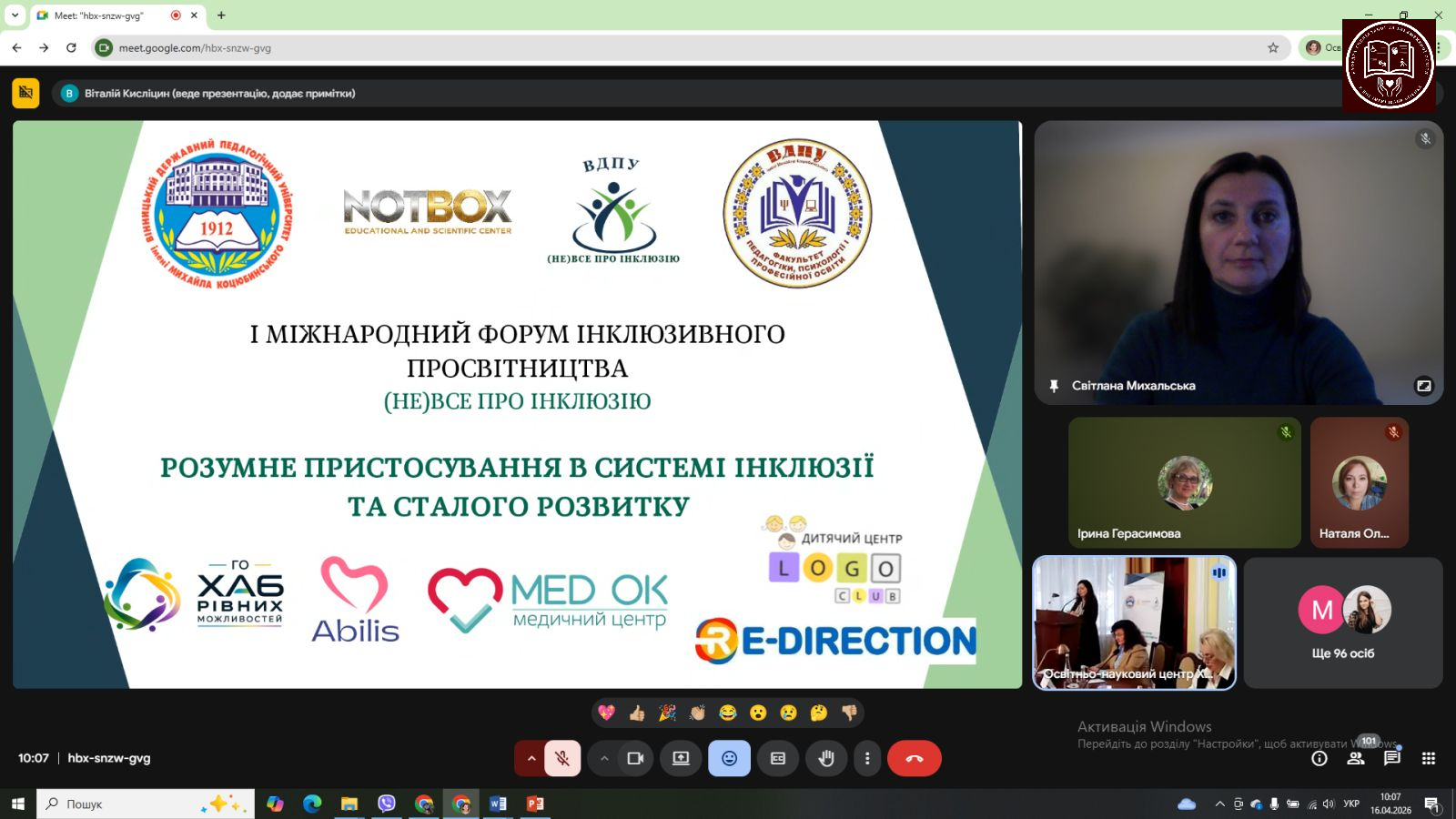 16 квітня 2026 року Світлана Михальська, доктор психологічних наук, професор, взяла участь у І Міжнародному форумі інклюзивного просвітництва «Розумне пристосування в системі інклюзії та сталого розвитку». Світлана Анатоліївна виступила з доповіддю на тему: «Реалізація принципу безбар’єрності в освітньому процесі ЗВО як запорука якісної освіти».