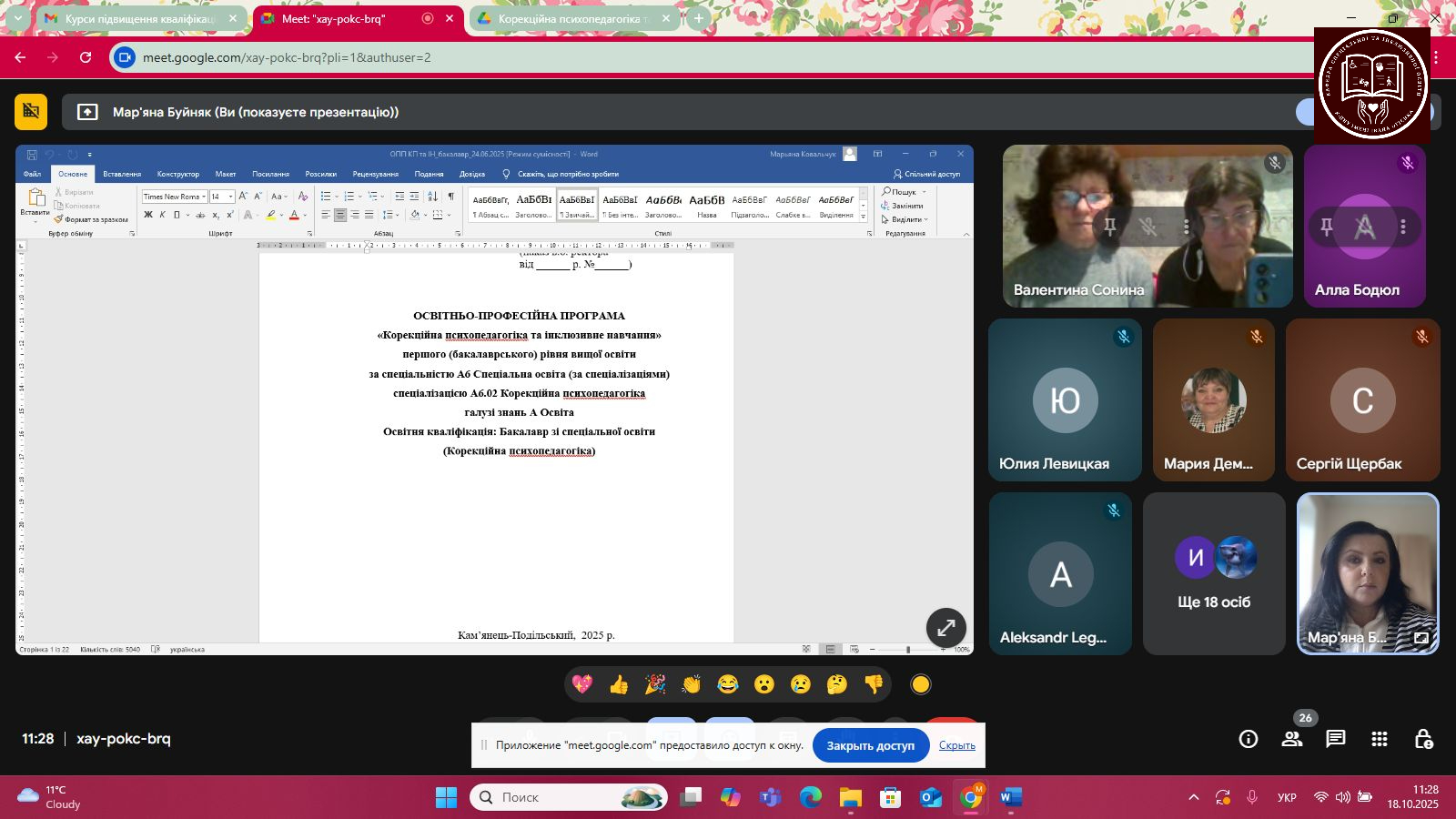18 жовтня 2025 р. в межах щорічного моніторингу освітньо-професійних програм в Кам’янець-Подільському національному університеті імені Івана Огієнка відбулося обговорення ОПП “Корекційна психопедагогіка та інклюзивне навчання” першого (бакалаврського) рівня вищої освіти з фахівцями-практиками КУ “Ізмаїльський навчально-реабілітаційний центр” Одеської обласної ради та закладів освіти м. Кам’янця-Подільського. Фахівці схвально оцінили змістове наповнення ОПП та зазначили, що обов’язкові освітні компоненти дозволять в повному обсязі сформувати професійні (фахові) компетентності майбутніх корекційних педагогів. В процесі обговорення фахівці-практики наголосили на важливості формування soft skills та навичок використання інформаційно-комунікаційних технологій у професійній діяльності корекційного педагога. Зазначені рекомендації буде враховано при розробці робочих програм навчальних дисциплін.