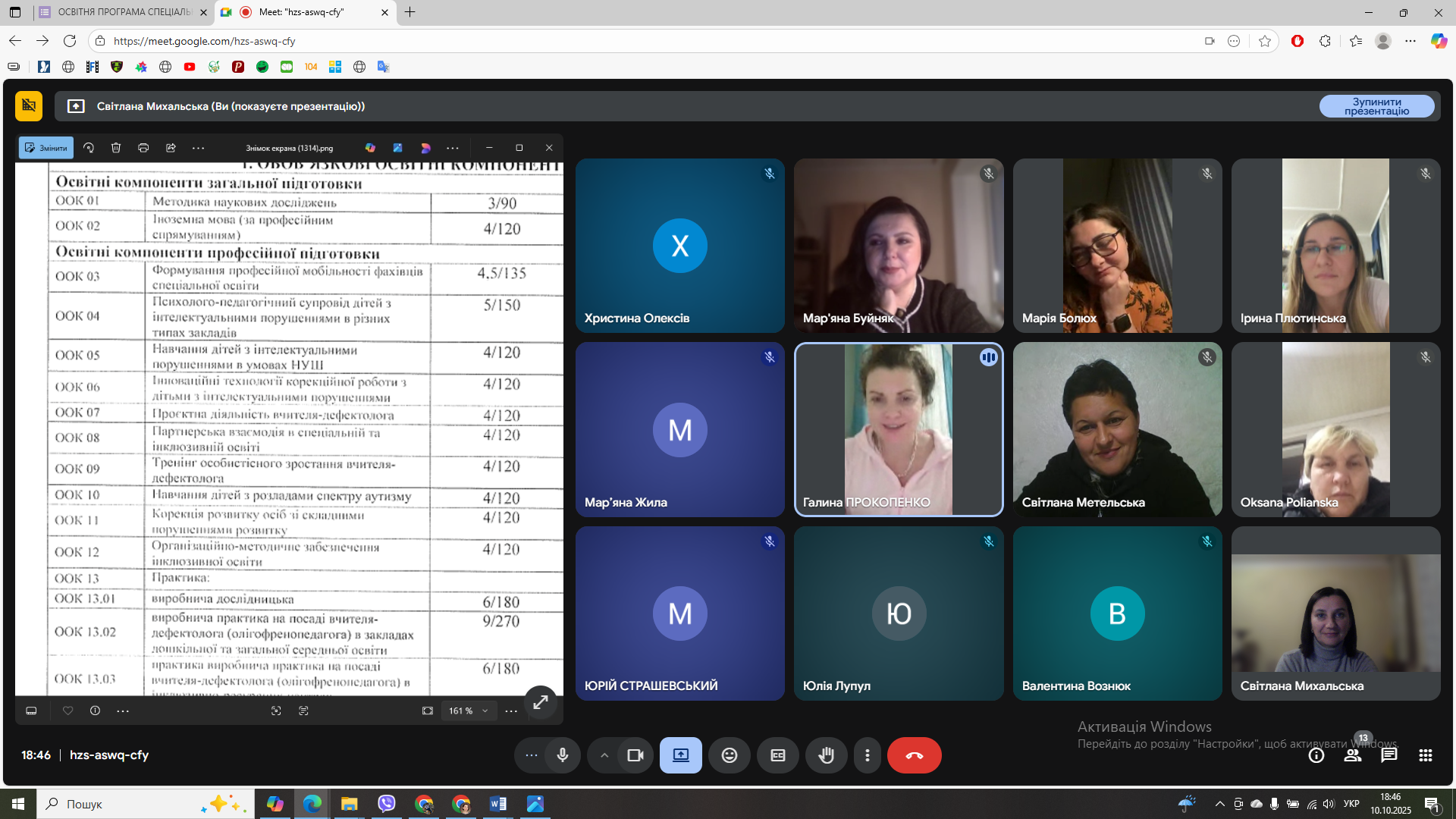 В рамках проведення моніторингу ОПП 10 жовтня 2025 року гарант освітньо-професійної програми Спеціальна освіта (Олігофренопедагогіка) другого (магістерського) рівня вищої освіти док. психол. наук, професор Михальська С.А. провела зустріч зі здобувачами вищої освіти заочної форми навчання. Під час зустрічі обговорили програмні результати навчання, освітні компоненти ОП Спеціальна освіта (Олігофренопедагогіка) та цілі сталого розвитку.