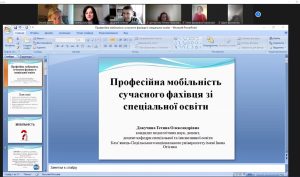 20 квітня 2023 року кандидат педагогічних наук, доцент Тетяна Докучина провела гостьову лекцію на тему: “Професійна мобільність сучасного фахівця зі спеціальної освіти” у межах угоди про співпрацю між нашою кафедрою та кафедрою спеціальної та інклюзивної освіти СумДПУ імені А.С. Макаренка для здобувачів другого (магістерського) рівня ВО спеціальності 016 Спеціальна освіта (016.02 Олігофренопедагогіка).