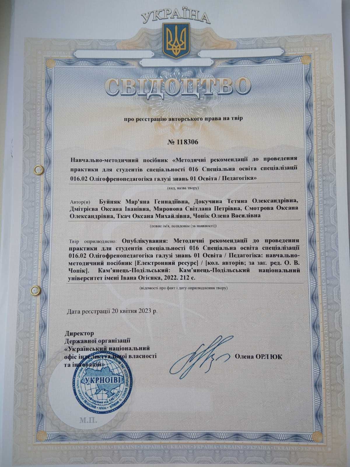 Викладачі кафедри спеціальної та інклюзивної освіти отримали свідоцтво про реєстрацію авторського права на твір: Методичні рекомендації до проведення практики для студентів спеціальності 016 Спеціальна освіта спеціалізації 016.02 Олігофренопедагогіка галузі знань 01 Освіта / Педагогіка: навчально-методичний посібник [Електронний ресурс] / [кол. авторів; за заг. ред. О. В. Чопік]. Кам’янець-Подільський : Кам’янець-Подільський національний університет імені Івана Огієнка, 2022. 212 c.