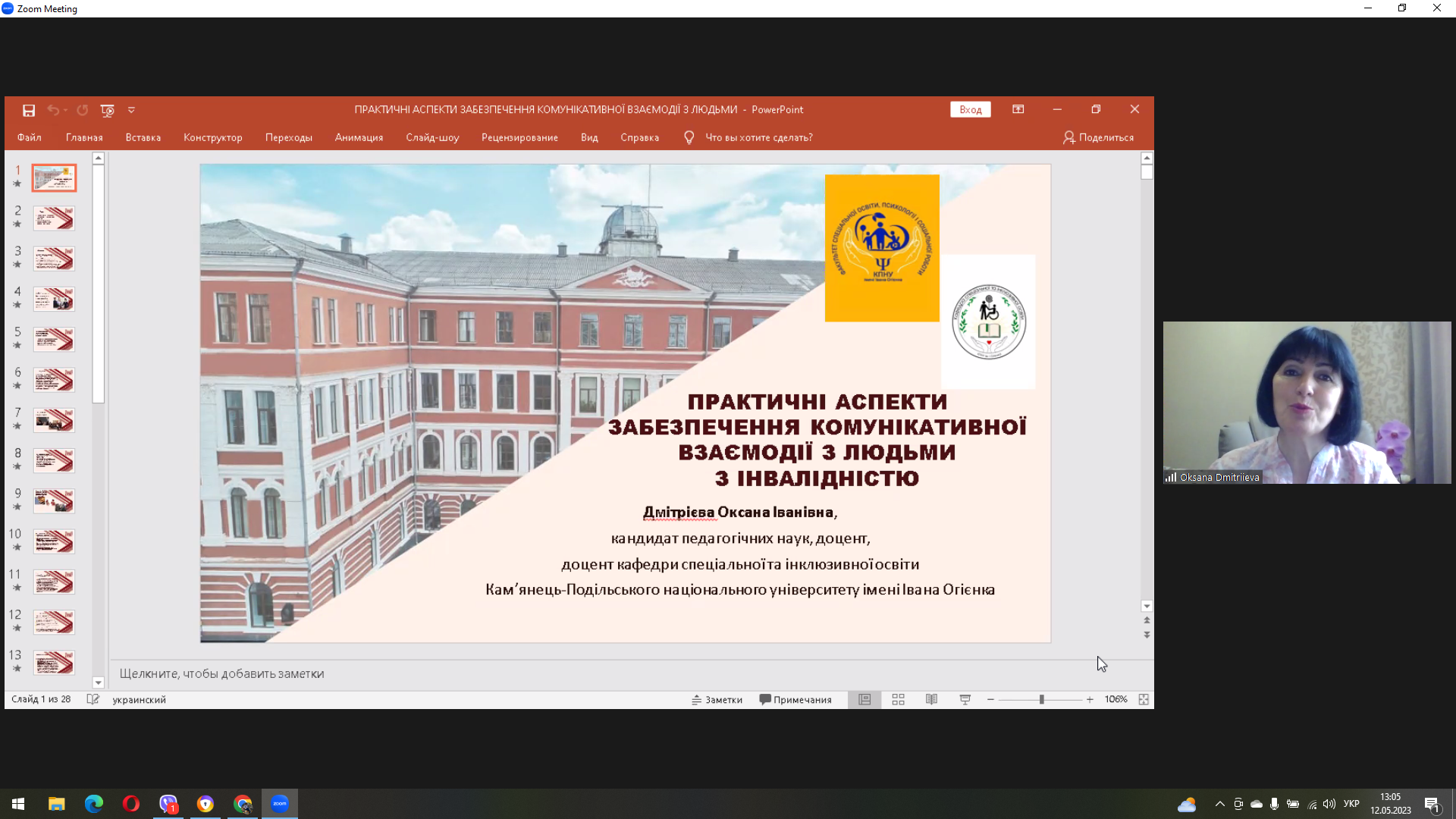 12 травня 2023 р. в межах укладеної угоди про співпрацю кафедри спеціальної та інклюзивної освіти Кам’янець-Подільського національного університету імені Івана Огієнка з кафедрою спеціальної та інклюзивної освіти Сумського державного педагогічного університету імені А.С. Макаренка для здобувачів вищої освіти першого (бакалаврського) та другого (магістерського) рівнів вищої освіти спеціальності 016 Спеціальна освіта, що навчаються за освітньо-професійною програмою «Спеціальна освіта (Олігофренопедагогіка. Логопедія)», відбулася гостьова лекція доцента кафедри спеціальної та інклюзивної освіти Кам’янець-Подільського національного університету імені Івана Огієнка кандидата педагогічних наук, доцента Дмітрієвої О.І. з теми «Практичні аспекти забезпечення комунікативної взаємодії з людьми з інвалідністю».