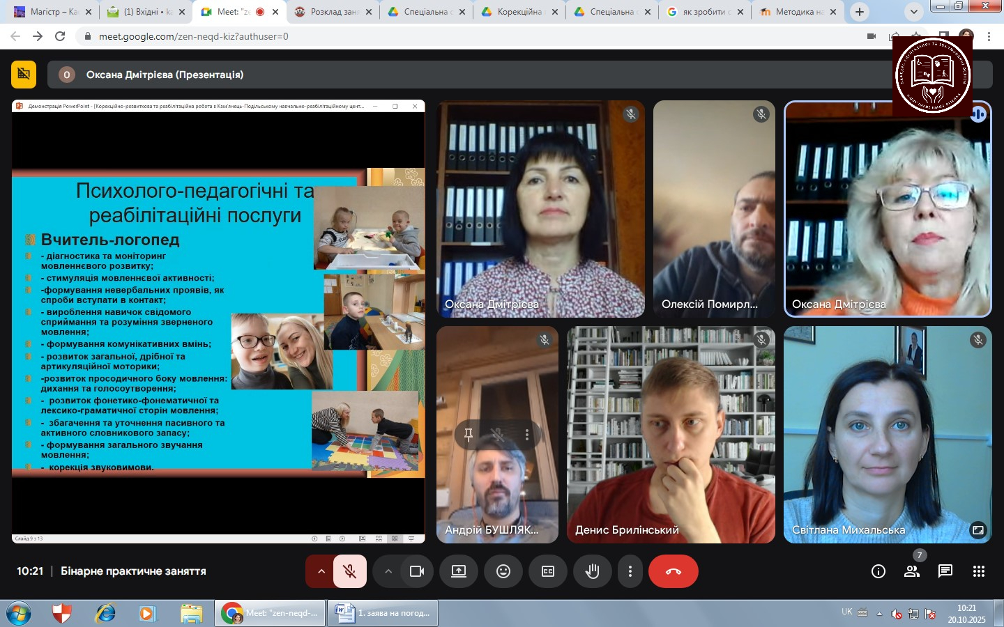 20 жовтня 2025 року відбулася зустріч гаранта ОПП «Спеціальна освіта (Олігофренопедагогіка. Логопедія)», кандидата педагогічних наук, доцента Оксани Дмітрієвої з членами робочої групи цієї ОПП, зокрема, з кандидатом педагогічних наук, доцентом Оленою Чопік та заступником директора з корекційно-розвиткової роботи Кам’янець-Подільського навчально-реабілітаційного центру Хмельницької обласної ради Ольгою Швець. Під час зустрічі було обговорено результати моніторингу ОПП «Спеціальна освіта (Олігофренопедагогіка. Логопедія)».