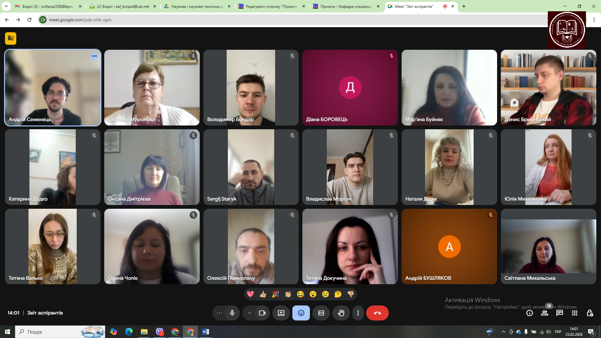 23 лютого 2026 року на засіданні кафедри спеціальної та інклюзивної освіти відбулася атестація аспірантів спеціальності 016 Спеціальна освіта. Аспіранти звітували про роботу в 1 семестрі 2025-2026 навчального року, зокрема, про виконання індивідуального плану; стан написання дисертаційного дослідження; публікації за результатами наукової роботи; апробацію результатів на конференціях.