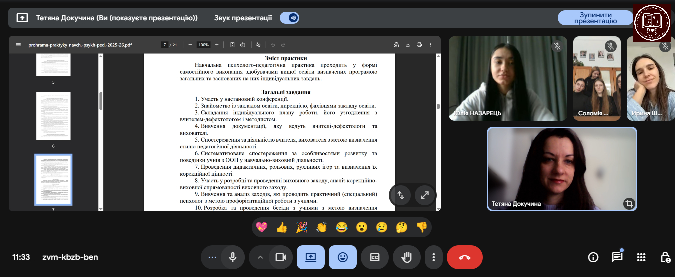 12.02.2026 р. відбулася настановна конференція з виробничої педагогічної практики в закладах загальної середньої освіти, навчально-реабілітаційних закладах на посаді вчителя-дефектолога для здобувачів вищої освіти першого (бакалаврського) рівня вищої освіти спеціальності 016 Спеціальна освіта, що навчаються за освітньою програмою «Спеціальна освіта (Олігофренопедагогіка. Логопедія)» денної форми навчання, яку провела керівник практики, доцент кафедри спеціальної та інклюзивної освіти, кандидат педагогічних наук, доцент Оксана Дмітрієва.