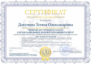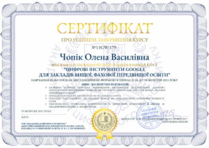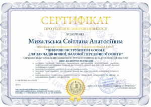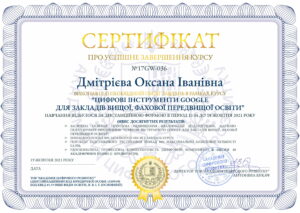 Викладачі кафедри спеціальної та інклюзивної освіти в період з 4 жовтня по 18 жовтня приймали участь в онлайн-курсі освітньої програми підвищення кваліфікації педагогічних, науково-педагогічних працівників «Цифрові інструменти Google для закладів вищої, фахової передвищої освіти». Вітаємо з отриманням сертифікату про успішне завершення даного курсу в.о.завідувача кафедри спеціальної та інклюзивної освіти, докт. психол. наук, доцента Михальську Світлану Анатоліївну, канд. пед. наук, доцента Дмітрієву Оксану Іванівну, канд. пед. наук, доцента Докучину Тетяну Олександрівну, канд. пед. наук, доцента Чопік Олену Василівну.