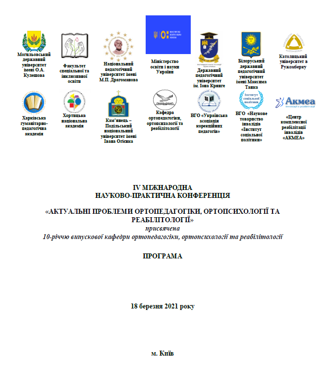18 березня 2021 року викладачі кафедри корекційної педагогіки та інклюзивної освіти взяли участь у ІV Міжнародній науково-практичній конференції «Актуальні проблеми ортопедагогіки, ортопсихології та реабілітології» присвяченій 10-річчю випускової кафедри ортопедагогіки, ортопсихології та реабілітології. Під час пленарного засідання із темою доповіді «Міждисциплінарна взаємодія фахівців як умова комплексної реабілітації осіб з особливими освітніми потребами» виступала Миронова Світлана Петрівна, доктор педагогічних наук, професор, завідувач кафедри корекційної педагогіки та інклюзивної освіти Кам’янець-Подільський національний університет імені Івана Огієнка.