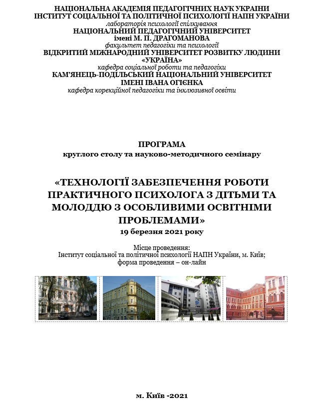 19 березня 2021 року викладачі кафедри корекційної педагогіки та інклюзивної освіти взяли участь у круглому столі та науково-методичному семінарі «Технології забезпечення роботи практичного психолога з дітьми та молоддю з особливими освітніми потребами». Кафедра корекційної педагогіки та інклюзивної освіти була співорганізатором заходу. В круглому столі та науково-методичному семінарі брало участь понад 700 учасників з усіх областей України.