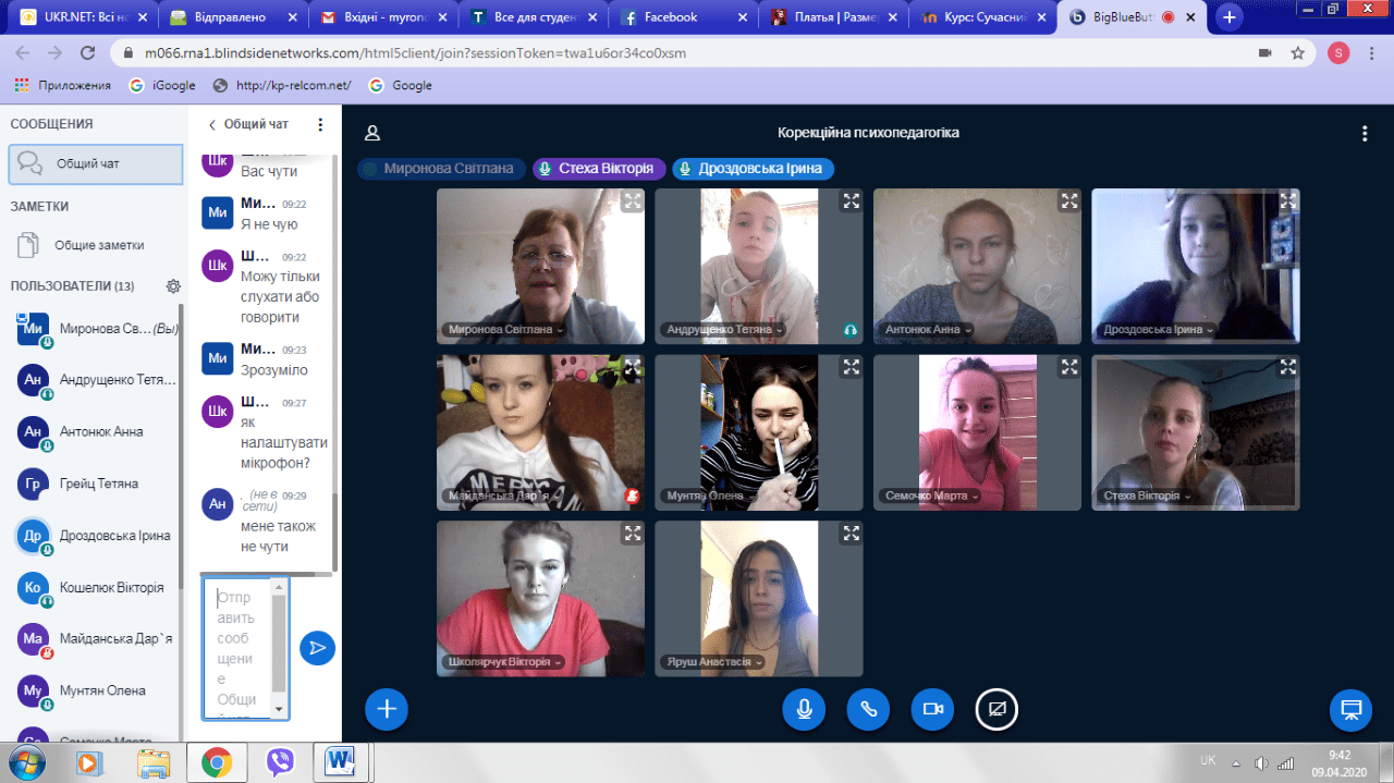 С.П.Миронова, доктор педагогічних наук, професор, завідувач кафедри корекційної педагогіки та інклюзивної освіти продовжує проводити пари дистанційно. Цього разу лекція з дисципліни «Корекційна психопедагогіка» з KorO1-B18 групою відбувалась на платформі MOODLE (BigBlueButtonBN).