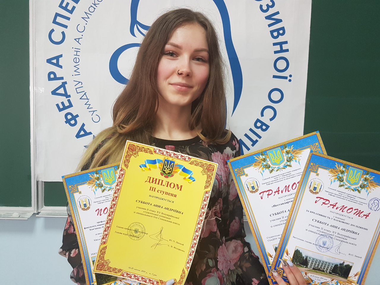 Вітаємо студентку ІV курсу факультету корекційної та соціальної педагогіки і психології Субботу Анну Андріївну (куратор Докучина Тетяна Олександрівна, кандидат педагогічних наук, доцент кафедри корекційної педагогіки та інклюзивної освіти) із призначенням академічної стипендії Президента України!