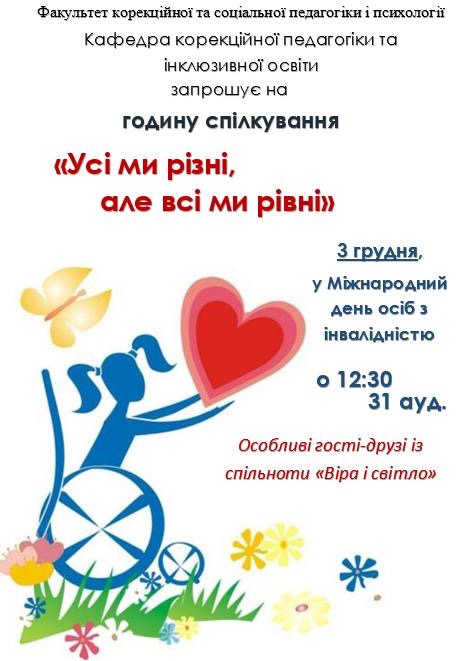 Традиційно 3 грудня 2019 року кафедрою корекційної педагогіки та інклюзивної освіти була проведена низка заходів до Міжнародного дня осіб з інвалідністю: