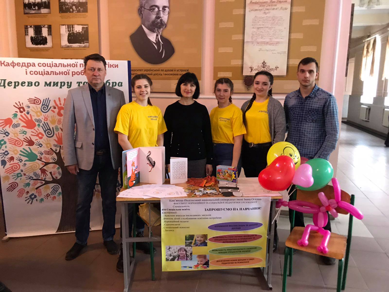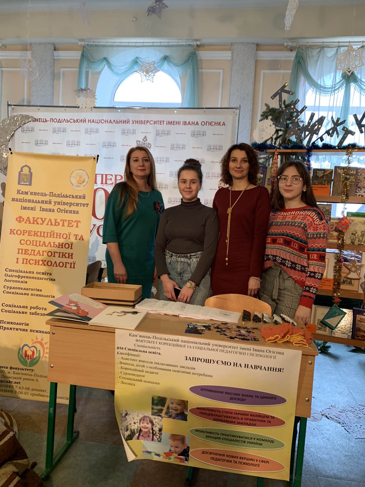 1.02.2020 року факультет корекційної та соціальної педагогіки і психології Кам’янець-Подільського національного університету імені Івана Огієнка разом з іншими факультетами провів День відкритих дверей. Усі бажаючі мали змогу ознайомитися з різними спеціальностями, якими можна опанувати, з особливостями навчання та перспективами працевлаштування. Після презентації факультету та виступу декана, кандидата психологічних наук, доцента Співака В.І., усі ми мали можливість попрацювати з бажаючими на локаціях. Представляючи спеціальність 016 Спеціальна освіта Олігофренопедагогіка. Спеціальна психологія / Логопедія, нам із студентами було приємно, що майбутні абітурієнти приїхали зі своїми батьками з Львівщини, Чернівеччини, Івано-Франківщини, Тернопільщини, Вінничини, розповідали про своїх знайомих, друзів, які уже закінчили навчання у нас і про їхні позитивні згадки про викладачів, кафедру та навчання. Приємно було бачити, що наші місцеві корекційні педагоги, у яких зовсім недавно викладачі нашої кафедри проводили науково-практичні семінари і тренінги, прийшли зі своїми дітьми-випускниками.